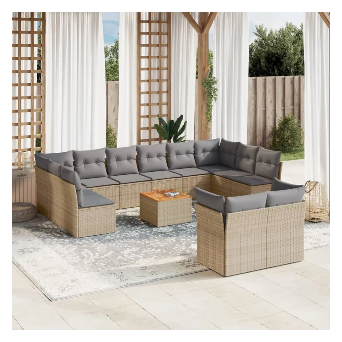 Cet ensemble de canapés de jardin est le complément parfait de votre arrière-cour, terrasse ou patio, offrant un espace confortable et accueillant pour discuter avec la famille et les amis ou simplement se détendre et profiter de l'extérieur. Matériau durable : la résine tressée, également connue sous le nom de poly rotin, est un matériau synthétique solide et nécessitant peu d'entretien qui ressemble au rotin naturel. Il est léger, facile à nettoyer et couramment utilisé pour les meubles d'extérieur en raison de sa durabilité et de ses propriétés de résistance aux intempéries.Fonction de rangement avec sac résistant à l'eau : chaque siège de jardin dispose d'un espace de rangement sous l'assise, complété par un sac résistant à l'eau pour ranger les coussins, les jouets et d'autres objets. Les sacs intérieurs sont dotés d'un couvercle et peuvent être solidement fixés aux sièges à l'aide de bandes auto-agrippantes pour plus de stabilité.Dessus stable et facile à nettoyer : cette table de jardin a un dessus en bois d'acacia robuste, durable et facile à nettoyer avec un chiffon humide.Housse amovible et lavable : ces coussins de siège sont dotés de housses amovibles pour un lavage et un entretien faciles.Conception modulaire : cet ensemble de meubles d'extérieur a une conception modulaire, ce qui le rend complètement flexible et facile à déplacer, afin que vous puissiez créer un agencement de meubles d'extérieur personnalisé. Bon à savoir :Pour que vos meubles d'extérieur restent beaux, nous vous recommandons de les protéger avec une housse imperméable.