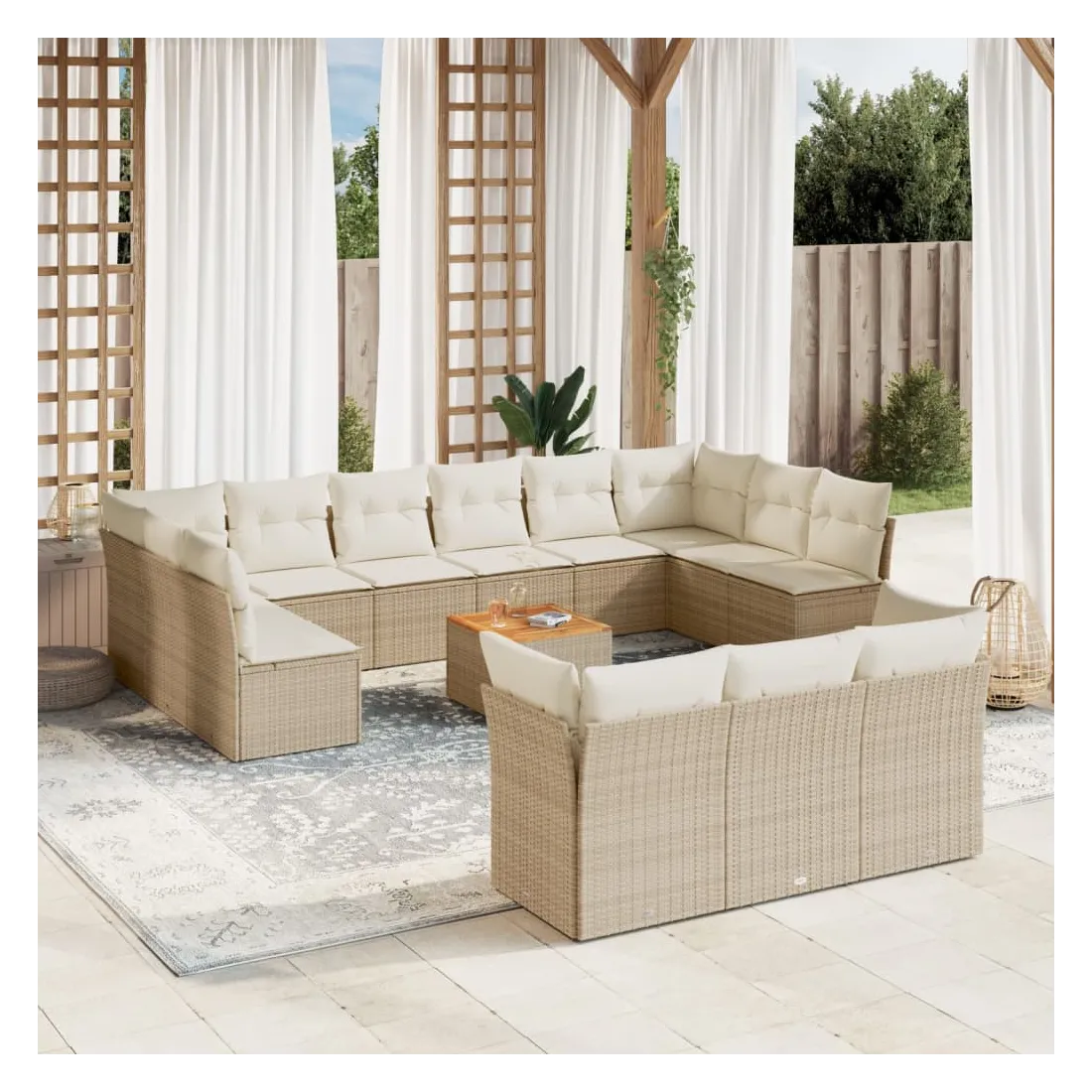 Cet ensemble de canapés de jardin est le complément parfait de votre arrière-cour, terrasse ou patio, offrant un espace confortable et accueillant pour discuter avec la famille et les amis ou simplement se détendre et profiter de l'extérieur. Matériau durable : la résine tressée, également connue sous le nom de poly rotin, est un matériau synthétique solide et nécessitant peu d'entretien qui ressemble au rotin naturel. Il est léger, facile à nettoyer et couramment utilisé pour les meubles d'extérieur en raison de sa durabilité et de ses propriétés de résistance aux intempéries.Fonction de rangement avec sac résistant à l'eau : chaque siège de jardin dispose d'un espace de rangement sous l'assise, complété par un sac résistant à l'eau pour ranger les coussins, les jouets et d'autres objets. Les sacs intérieurs sont dotés d'un couvercle et peuvent être solidement fixés aux sièges à l'aide de bandes auto-agrippantes pour plus de stabilité.Dessus stable et facile à nettoyer : cette table de jardin a un dessus en bois d'acacia robuste, durable et facile à nettoyer avec un chiffon humide.Housse amovible et lavable : ces coussins de siège sont dotés de housses amovibles pour un lavage et un entretien faciles.Conception modulaire : cet ensemble de meubles d'extérieur a une conception modulaire, ce qui le rend complètement flexible et facile à déplacer, afin que vous puissiez créer un agencement de meubles d'extérieur personnalisé. Bon à savoir :Pour que vos meubles d'extérieur restent beaux, nous vous recommandons de les protéger avec une housse imperméable.