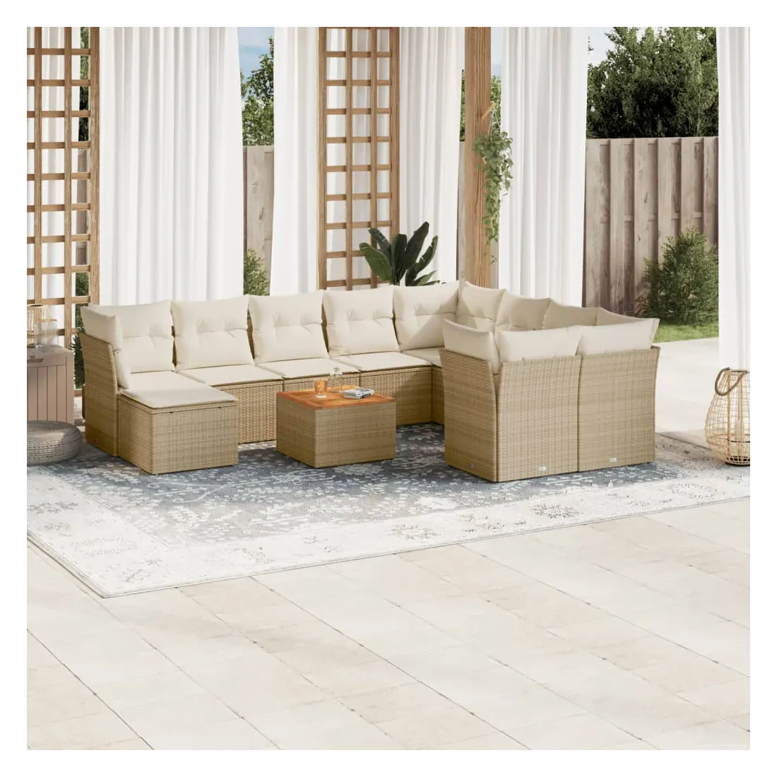 Cet ensemble de canapés de jardin est le complément parfait de votre arrière-cour, terrasse ou patio, offrant un espace confortable et accueillant pour discuter avec la famille et les amis ou simplement se détendre et profiter de l'extérieur. Matériau durable : la résine tressée, également connue sous le nom de poly rotin, est un matériau synthétique solide et nécessitant peu d'entretien qui ressemble au rotin naturel. Il est léger, facile à nettoyer et couramment utilisé pour les meubles d'extérieur en raison de sa durabilité et de ses propriétés de résistance aux intempéries.Fonction de rangement avec sac résistant à l'eau : chaque siège de jardin dispose d'un espace de rangement sous l'assise, complété par un sac résistant à l'eau pour ranger les coussins, les jouets et d'autres objets. Les sacs intérieurs sont dotés d'un couvercle et peuvent être solidement fixés aux sièges à l'aide de bandes auto-agrippantes pour plus de stabilité.Dessus stable et facile à nettoyer : cette table de jardin a un dessus en bois d'acacia robuste, durable et facile à nettoyer avec un chiffon humide.Pouf polyvalent : le tabouret est polyvalent, servant de repose-pieds confortable lorsque vous vous prélassez sur le canapé ou de siège supplémentaire dans votre jardin.Conception modulaire : cet ensemble de meubles d'extérieur a une conception modulaire, ce qui le rend complètement flexible et facile à déplacer, afin que vous puissiez créer un agencement de meubles d'extérieur personnalisé. Bon à savoir :Pour que vos meubles d'extérieur restent beaux, nous vous recommandons de les protéger avec une housse imperméable.