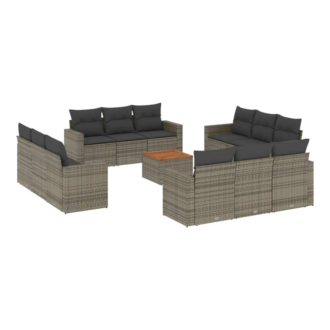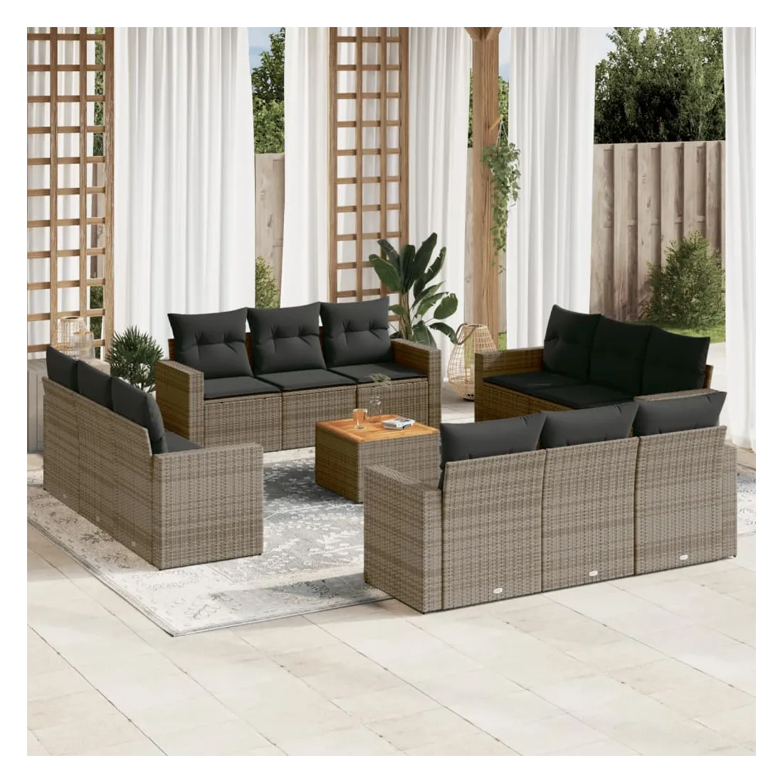 Cet ensemble de canapés de jardin est le complément parfait de votre arrière-cour, terrasse ou patio, offrant un espace confortable et accueillant pour discuter avec la famille et les amis ou simplement se détendre et profiter de l'extérieur. Matériau durable : la résine tressée, également connue sous le nom de poly rotin, est un matériau synthétique solide et nécessitant peu d'entretien qui ressemble au rotin naturel. Il est léger, facile à nettoyer et couramment utilisé pour les meubles d'extérieur en raison de sa durabilité et de ses propriétés de résistance aux intempéries.Fonction de rangement avec sac résistant à l'eau : chaque siège de jardin dispose d'un espace de rangement sous l'assise, complété par un sac résistant à l'eau pour ranger les coussins, les jouets et d'autres objets. Les sacs intérieurs sont dotés d'un couvercle et peuvent être solidement fixés aux sièges à l'aide de bandes auto-agrippantes pour plus de stabilité.Dessus stable et facile à nettoyer : cette table de jardin a un dessus en bois d'acacia robuste, durable et facile à nettoyer avec un chiffon humide.Housse amovible et lavable : ces coussins de siège sont dotés de housses amovibles pour un lavage et un entretien faciles.Conception modulaire : cet ensemble de meubles d'extérieur a une conception modulaire, ce qui le rend complètement flexible et facile à déplacer, afin que vous puissiez créer un agencement de meubles d'extérieur personnalisé. Bon à savoir :Pour que vos meubles d'extérieur restent beaux, nous vous recommandons de les protéger avec une housse imperméable.