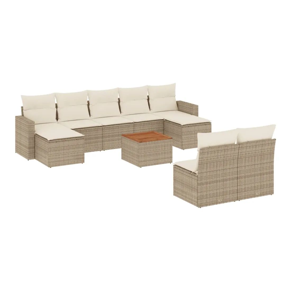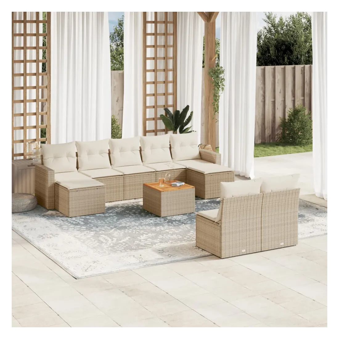 Cet ensemble de canapés de jardin est le complément parfait de votre arrière-cour, terrasse ou patio, offrant un espace confortable et accueillant pour discuter avec la famille et les amis ou simplement se détendre et profiter de l'extérieur. Matériau durable : la résine tressée, également connue sous le nom de poly rotin, est un matériau synthétique solide et nécessitant peu d'entretien qui ressemble au rotin naturel. Il est léger, facile à nettoyer et couramment utilisé pour les meubles d'extérieur en raison de sa durabilité et de ses propriétés de résistance aux intempéries.Fonction de rangement avec sac résistant à l'eau : chaque siège de jardin dispose d'un espace de rangement sous l'assise, complété par un sac résistant à l'eau pour ranger les coussins, les jouets et d'autres objets. Les sacs intérieurs sont dotés d'un couvercle et peuvent être solidement fixés aux sièges à l'aide de bandes auto-agrippantes pour plus de stabilité.Dessus stable et facile à nettoyer : cette table de jardin a un dessus en bois d'acacia robuste, durable et facile à nettoyer avec un chiffon humide.Pouf polyvalent : le tabouret est polyvalent, servant de repose-pieds confortable lorsque vous vous prélassez sur le canapé ou de siège supplémentaire dans votre jardin.Conception modulaire : cet ensemble de meubles d'extérieur a une conception modulaire, ce qui le rend complètement flexible et facile à déplacer, afin que vous puissiez créer un agencement de meubles d'extérieur personnalisé. Bon à savoir :Pour que vos meubles d'extérieur restent beaux, nous vous recommandons de les protéger avec une housse imperméable.