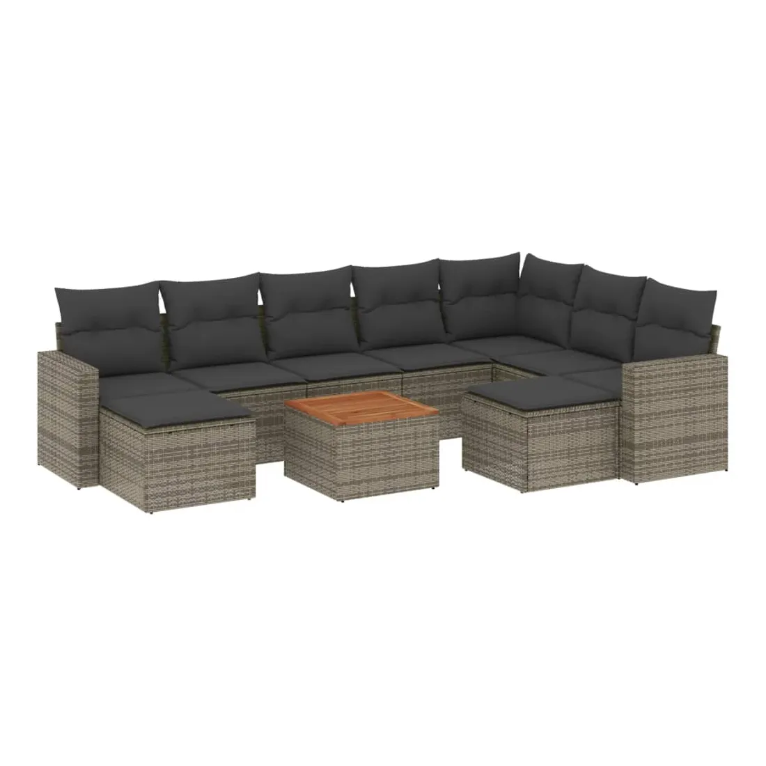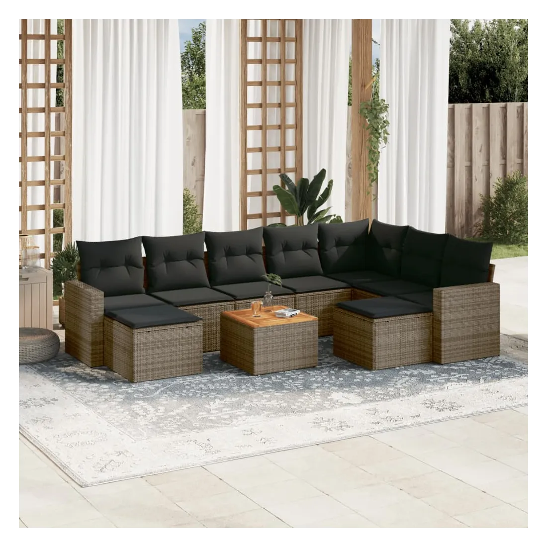 Cet ensemble de canapés de jardin est le complément parfait de votre arrière-cour, terrasse ou patio, offrant un espace confortable et accueillant pour discuter avec la famille et les amis ou simplement se détendre et profiter de l'extérieur. Matériau durable : la résine tressée, également connue sous le nom de poly rotin, est un matériau synthétique solide et nécessitant peu d'entretien qui ressemble au rotin naturel. Il est léger, facile à nettoyer et couramment utilisé pour les meubles d'extérieur en raison de sa durabilité et de ses propriétés de résistance aux intempéries.Fonction de rangement avec sac résistant à l'eau : chaque siège de jardin dispose d'un espace de rangement sous l'assise, complété par un sac résistant à l'eau pour ranger les coussins, les jouets et d'autres objets. Les sacs intérieurs sont dotés d'un couvercle et peuvent être solidement fixés aux sièges à l'aide de bandes auto-agrippantes pour plus de stabilité.Dessus stable et facile à nettoyer : cette table de jardin a un dessus en bois d'acacia robuste, durable et facile à nettoyer avec un chiffon humide.Pouf polyvalent : le tabouret est polyvalent, servant de repose-pieds confortable lorsque vous vous prélassez sur le canapé ou de siège supplémentaire dans votre jardin.Conception modulaire : cet ensemble de meubles d'extérieur a une conception modulaire, ce qui le rend complètement flexible et facile à déplacer, afin que vous puissiez créer un agencement de meubles d'extérieur personnalisé. Bon à savoir :Pour que vos meubles d'extérieur restent beaux, nous vous recommandons de les protéger avec une housse imperméable.