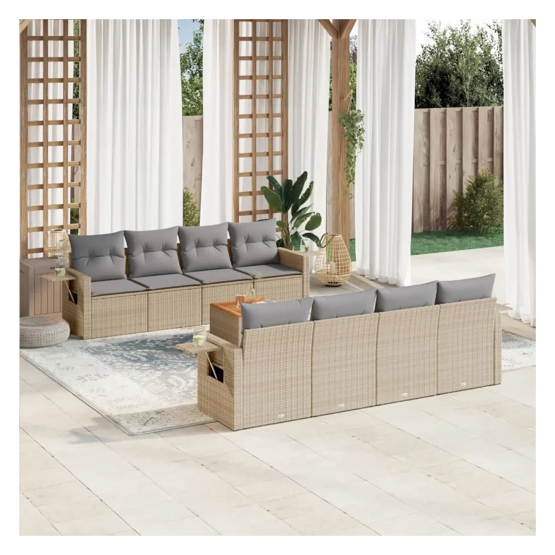Cet ensemble de canapés de jardin est le complément parfait de votre arrière-cour, terrasse ou patio, offrant un espace confortable et accueillant pour discuter avec la famille et les amis ou simplement se détendre et profiter de l'extérieur. Matériau durable : la résine tressée, également connue sous le nom de poly rotin, est un matériau synthétique solide et nécessitant peu d'entretien qui ressemble au rotin naturel. Il est léger, facile à nettoyer et couramment utilisé pour les meubles d'extérieur en raison de sa durabilité et de ses propriétés de résistance aux intempéries.Fonction de rangement avec sac résistant à l'eau : chaque siège de jardin dispose d'un espace de rangement sous l'assise, complété par un sac résistant à l'eau pour ranger les coussins, les jouets et d'autres objets. Les sacs intérieurs sont dotés d'un couvercle et peuvent être solidement fixés aux sièges à l'aide de bandes auto-agrippantes pour plus de stabilité.Dessus stable et facile à nettoyer : cette table de jardin a un dessus en bois d'acacia robuste, durable et facile à nettoyer avec un chiffon humide.Table d'appoint pratique : ce mobilier d'extérieur comprend des tables d'appoint pliables avec un ressort à gaz sur les accoudoirs, offrant des endroits pratiques pour garder vos essentiels à portée de main.Conception modulaire : cet ensemble de meubles d'extérieur a une conception modulaire, ce qui le rend complètement flexible et facile à déplacer, afin que vous puissiez créer un agencement de meubles d'extérieur personnalisé. Bon à savoir :Pour que vos meubles d'extérieur restent beaux, nous vous recommandons de les protéger avec une housse imperméable.
