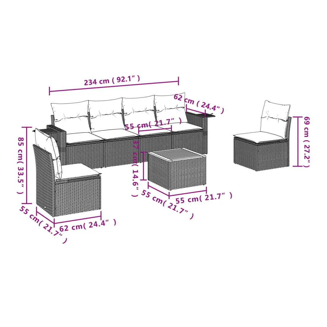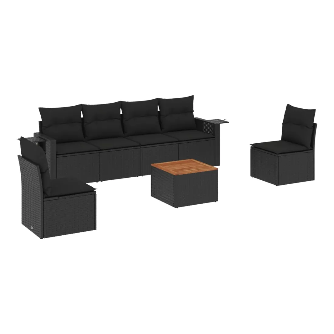 Cet ensemble de canapés de jardin est le complément parfait de votre arrière-cour, terrasse ou patio, offrant un espace confortable et accueillant pour discuter avec la famille et les amis ou simplement se détendre et profiter de l'extérieur. Matériau durable : la résine tressée, également connue sous le nom de poly rotin, est un matériau synthétique solide et nécessitant peu d'entretien qui ressemble au rotin naturel. Il est léger, facile à nettoyer et couramment utilisé pour les meubles d'extérieur en raison de sa durabilité et de ses propriétés de résistance aux intempéries.Fonction de rangement avec sac résistant à l'eau : chaque siège de jardin dispose d'un espace de rangement sous l'assise, complété par un sac résistant à l'eau pour ranger les coussins, les jouets et d'autres objets. Les sacs intérieurs sont dotés d'un couvercle et peuvent être solidement fixés aux sièges à l'aide de bandes auto-agrippantes pour plus de stabilité.Dessus stable et facile à nettoyer : cette table de jardin a un dessus en bois d'acacia robuste, durable et facile à nettoyer avec un chiffon humide.Table d'appoint pratique : ce mobilier d'extérieur comprend des tables d'appoint pliables avec un ressort à gaz sur les accoudoirs, offrant des endroits pratiques pour garder vos essentiels à portée de main.Conception modulaire : cet ensemble de meubles d'extérieur a une conception modulaire, ce qui le rend complètement flexible et facile à déplacer, afin que vous puissiez créer un agencement de meubles d'extérieur personnalisé. Bon à savoir :Pour que vos meubles d'extérieur restent beaux, nous vous recommandons de les protéger avec une housse imperméable.