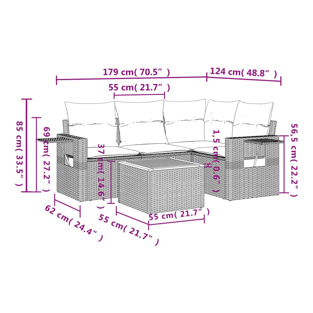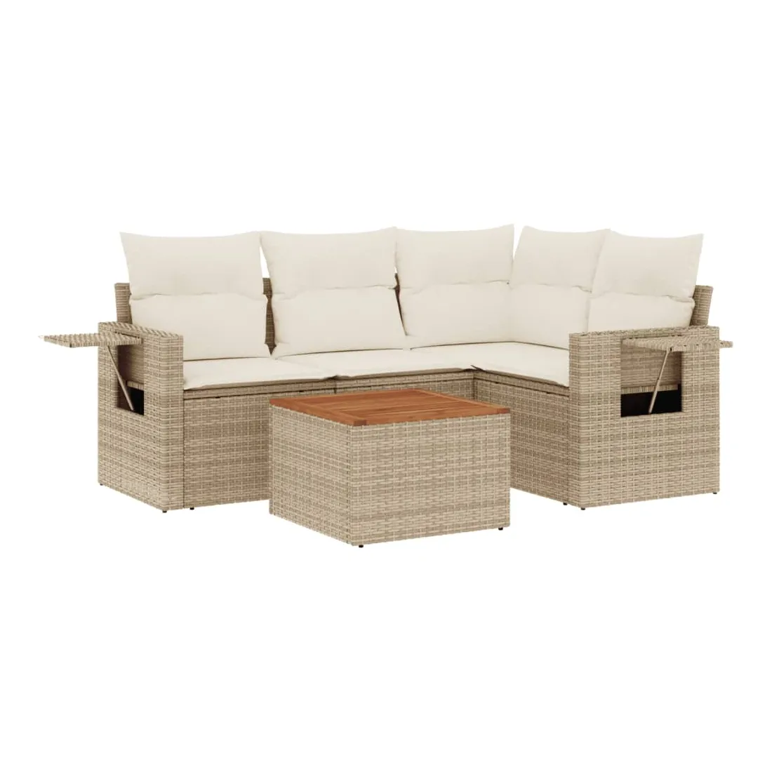 Cet ensemble de canapés de jardin est le complément parfait de votre arrière-cour, terrasse ou patio, offrant un espace confortable et accueillant pour discuter avec la famille et les amis ou simplement se détendre et profiter de l'extérieur. Matériau durable : la résine tressée, également connue sous le nom de poly rotin, est un matériau synthétique solide et nécessitant peu d'entretien qui ressemble au rotin naturel. Il est léger, facile à nettoyer et couramment utilisé pour les meubles d'extérieur en raison de sa durabilité et de ses propriétés de résistance aux intempéries.Fonction de rangement avec sac résistant à l'eau : chaque siège de jardin dispose d'un espace de rangement sous l'assise, complété par un sac résistant à l'eau pour ranger les coussins, les jouets et d'autres objets. Les sacs intérieurs sont dotés d'un couvercle et peuvent être solidement fixés aux sièges à l'aide de bandes auto-agrippantes pour plus de stabilité.Dessus stable et facile à nettoyer : cette table de jardin a un dessus en bois d'acacia robuste, durable et facile à nettoyer avec un chiffon humide.Table d'appoint pratique : ce mobilier d'extérieur comprend des tables d'appoint pliables avec un ressort à gaz sur les accoudoirs, offrant des endroits pratiques pour garder vos essentiels à portée de main.Conception modulaire : cet ensemble de meubles d'extérieur a une conception modulaire, ce qui le rend complètement flexible et facile à déplacer, afin que vous puissiez créer un agencement de meubles d'extérieur personnalisé. Bon à savoir :Pour que vos meubles d'extérieur restent beaux, nous vous recommandons de les protéger avec une housse imperméable.