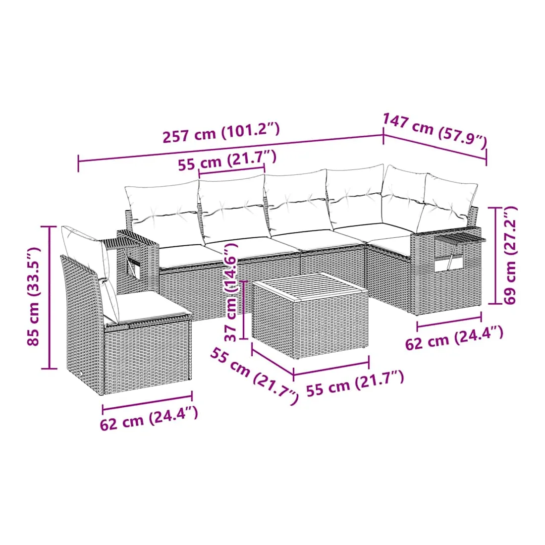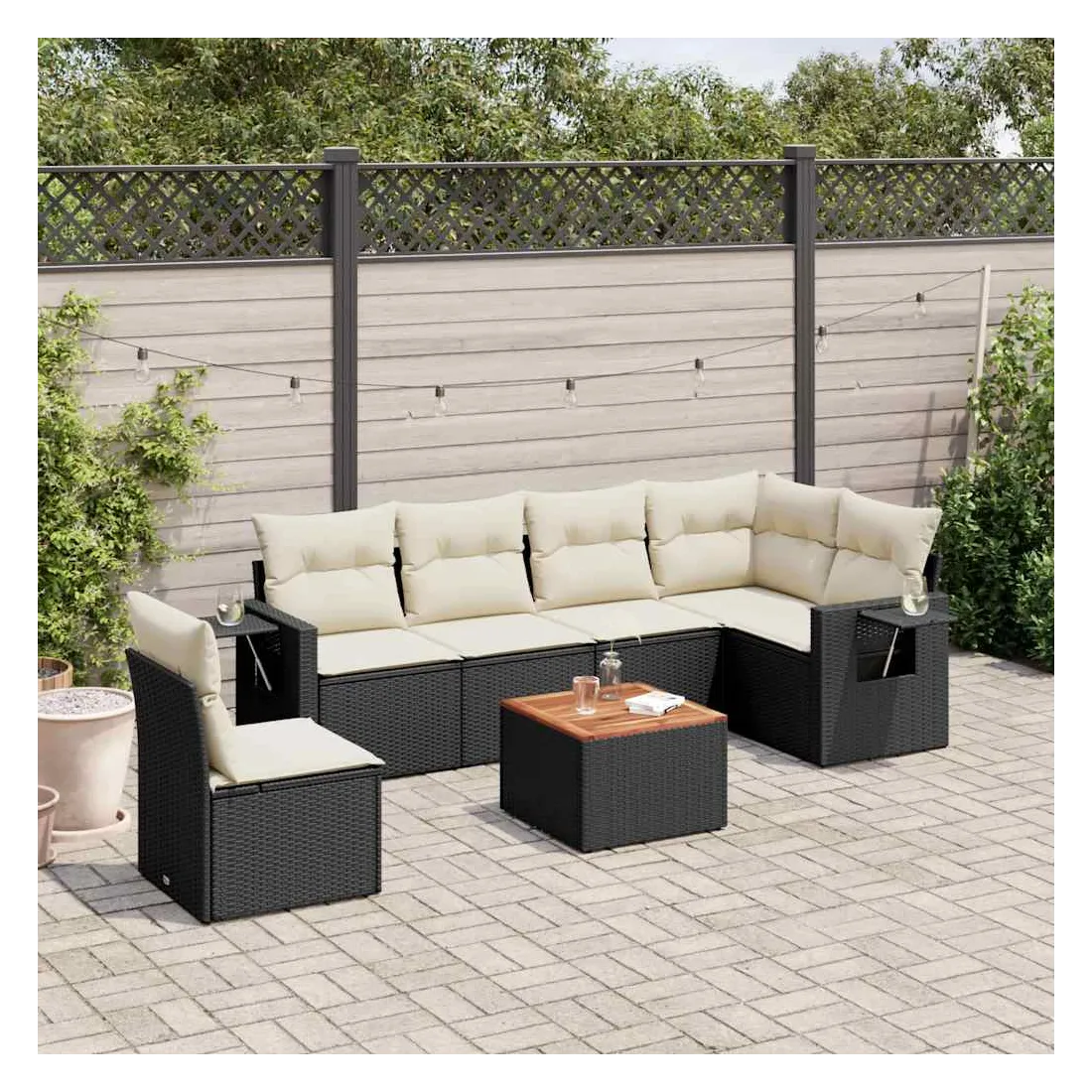 Cet ensemble de canapés de jardin est le complément parfait de votre arrière-cour, terrasse ou patio, offrant un espace confortable et accueillant pour discuter avec la famille et les amis ou simplement se détendre et profiter de l'extérieur. Matériau durable : la résine tressée, également connue sous le nom de poly rotin, est un matériau synthétique solide et nécessitant peu d'entretien qui ressemble au rotin naturel. Il est léger, facile à nettoyer et couramment utilisé pour les meubles d'extérieur en raison de sa durabilité et de ses propriétés de résistance aux intempéries.Fonction de rangement avec sac résistant à l'eau : chaque siège de jardin dispose d'un espace de rangement sous l'assise, complété par un sac résistant à l'eau pour ranger les coussins, les jouets et d'autres objets. Les sacs intérieurs sont dotés d'un couvercle et peuvent être solidement fixés aux sièges à l'aide de bandes auto-agrippantes pour plus de stabilité.Dessus stable et facile à nettoyer : cette table de jardin a un dessus en bois d'acacia robuste, durable et facile à nettoyer avec un chiffon humide.Table d'appoint pratique : ce mobilier d'extérieur comprend des tables d'appoint pliables avec un ressort à gaz sur les accoudoirs, offrant des endroits pratiques pour garder vos essentiels à portée de main.Conception modulaire : cet ensemble de meubles d'extérieur a une conception modulaire, ce qui le rend complètement flexible et facile à déplacer, afin que vous puissiez créer un agencement de meubles d'extérieur personnalisé. Bon à savoir :Pour que vos meubles d'extérieur restent beaux, nous vous recommandons de les protéger avec une housse imperméable.