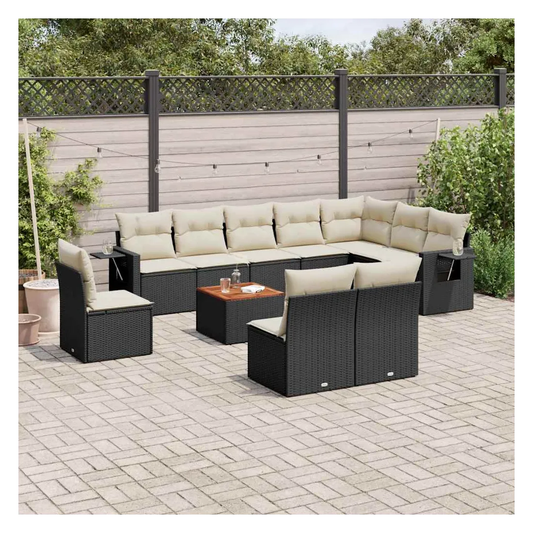 Cet ensemble de canapés de jardin est le complément parfait de votre arrière-cour, terrasse ou patio, offrant un espace confortable et accueillant pour discuter avec la famille et les amis ou simplement se détendre et profiter de l'extérieur. Matériau durable : la résine tressée, également connue sous le nom de poly rotin, est un matériau synthétique solide et nécessitant peu d'entretien qui ressemble au rotin naturel. Il est léger, facile à nettoyer et couramment utilisé pour les meubles d'extérieur en raison de sa durabilité et de ses propriétés de résistance aux intempéries.Fonction de rangement avec sac résistant à l'eau : chaque siège de jardin dispose d'un espace de rangement sous l'assise, complété par un sac résistant à l'eau pour ranger les coussins, les jouets et d'autres objets. Les sacs intérieurs sont dotés d'un couvercle et peuvent être solidement fixés aux sièges à l'aide de bandes auto-agrippantes pour plus de stabilité.Dessus stable et facile à nettoyer : cette table de jardin a un dessus en bois d'acacia robuste, durable et facile à nettoyer avec un chiffon humide.Table d'appoint pratique : ce mobilier d'extérieur comprend des tables d'appoint pliables avec un ressort à gaz sur les accoudoirs, offrant des endroits pratiques pour garder vos essentiels à portée de main.Conception modulaire : cet ensemble de meubles d'extérieur a une conception modulaire, ce qui le rend complètement flexible et facile à déplacer, afin que vous puissiez créer un agencement de meubles d'extérieur personnalisé. Bon à savoir :Pour que vos meubles d'extérieur restent beaux, nous vous recommandons de les protéger avec une housse imperméable.