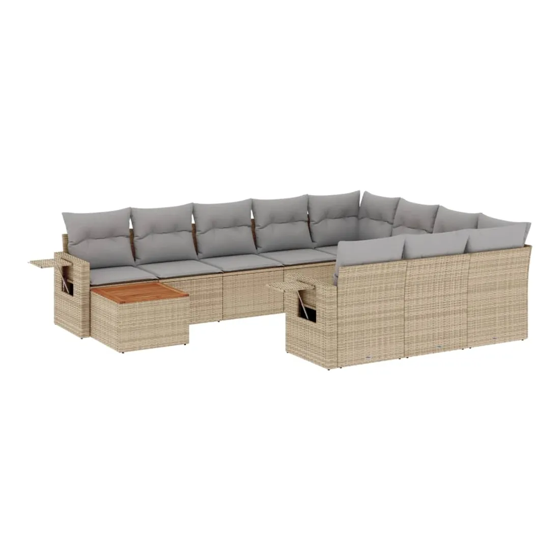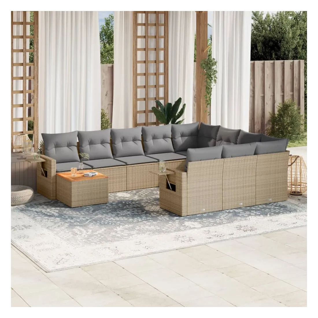 Cet ensemble de canapés de jardin est le complément parfait de votre arrière-cour, terrasse ou patio, offrant un espace confortable et accueillant pour discuter avec la famille et les amis ou simplement se détendre et profiter de l'extérieur. Matériau durable : la résine tressée, également connue sous le nom de poly rotin, est un matériau synthétique solide et nécessitant peu d'entretien qui ressemble au rotin naturel. Il est léger, facile à nettoyer et couramment utilisé pour les meubles d'extérieur en raison de sa durabilité et de ses propriétés de résistance aux intempéries.Fonction de rangement avec sac résistant à l'eau : chaque siège de jardin dispose d'un espace de rangement sous l'assise, complété par un sac résistant à l'eau pour ranger les coussins, les jouets et d'autres objets. Les sacs intérieurs sont dotés d'un couvercle et peuvent être solidement fixés aux sièges à l'aide de bandes auto-agrippantes pour plus de stabilité.Dessus stable et facile à nettoyer : cette table de jardin a un dessus en bois d'acacia robuste, durable et facile à nettoyer avec un chiffon humide.Table d'appoint pratique : ce mobilier d'extérieur comprend des tables d'appoint pliables avec un ressort à gaz sur les accoudoirs, offrant des endroits pratiques pour garder vos essentiels à portée de main.Conception modulaire : cet ensemble de meubles d'extérieur a une conception modulaire, ce qui le rend complètement flexible et facile à déplacer, afin que vous puissiez créer un agencement de meubles d'extérieur personnalisé. Bon à savoir :Pour que vos meubles d'extérieur restent beaux, nous vous recommandons de les protéger avec une housse imperméable.