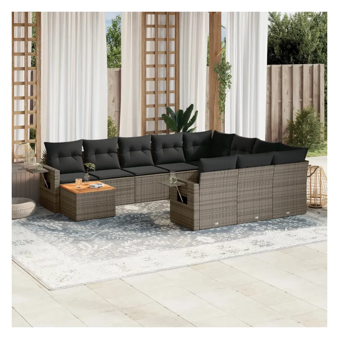 Cet ensemble de canapés de jardin est le complément parfait de votre arrière-cour, terrasse ou patio, offrant un espace confortable et accueillant pour discuter avec la famille et les amis ou simplement se détendre et profiter de l'extérieur. Matériau durable : la résine tressée, également connue sous le nom de poly rotin, est un matériau synthétique solide et nécessitant peu d'entretien qui ressemble au rotin naturel. Il est léger, facile à nettoyer et couramment utilisé pour les meubles d'extérieur en raison de sa durabilité et de ses propriétés de résistance aux intempéries.Fonction de rangement avec sac résistant à l'eau : chaque siège de jardin dispose d'un espace de rangement sous l'assise, complété par un sac résistant à l'eau pour ranger les coussins, les jouets et d'autres objets. Les sacs intérieurs sont dotés d'un couvercle et peuvent être solidement fixés aux sièges à l'aide de bandes auto-agrippantes pour plus de stabilité.Dessus stable et facile à nettoyer : cette table de jardin a un dessus en bois d'acacia robuste, durable et facile à nettoyer avec un chiffon humide.Table d'appoint pratique : ce mobilier d'extérieur comprend des tables d'appoint pliables avec un ressort à gaz sur les accoudoirs, offrant des endroits pratiques pour garder vos essentiels à portée de main.Conception modulaire : cet ensemble de meubles d'extérieur a une conception modulaire, ce qui le rend complètement flexible et facile à déplacer, afin que vous puissiez créer un agencement de meubles d'extérieur personnalisé. Bon à savoir :Pour que vos meubles d'extérieur restent beaux, nous vous recommandons de les protéger avec une housse imperméable.