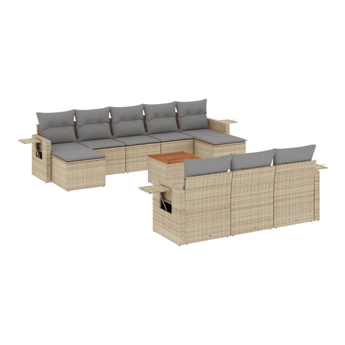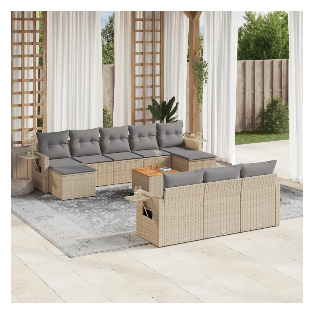 Cet ensemble de canapés de jardin est le complément parfait de votre arrière-cour, terrasse ou patio, offrant un espace confortable et accueillant pour discuter avec la famille et les amis ou simplement se détendre et profiter de l'extérieur. Matériau durable : la résine tressée, également connue sous le nom de poly rotin, est un matériau synthétique solide et nécessitant peu d'entretien qui ressemble au rotin naturel. Il est léger, facile à nettoyer et couramment utilisé pour les meubles d'extérieur en raison de sa durabilité et de ses propriétés de résistance aux intempéries.Fonction de rangement avec sac résistant à l'eau : chaque siège de jardin dispose d'un espace de rangement sous l'assise, complété par un sac résistant à l'eau pour ranger les coussins, les jouets et d'autres objets. Les sacs intérieurs sont dotés d'un couvercle et peuvent être solidement fixés aux sièges à l'aide de bandes auto-agrippantes pour plus de stabilité.Dessus stable et facile à nettoyer : cette table de jardin a un dessus en bois d'acacia robuste, durable et facile à nettoyer avec un chiffon humide.Table d'appoint pratique : ce mobilier d'extérieur comprend des tables d'appoint pliables avec un ressort à gaz sur les accoudoirs, offrant des endroits pratiques pour garder vos essentiels à portée de main.Conception modulaire : cet ensemble de meubles d'extérieur a une conception modulaire, ce qui le rend complètement flexible et facile à déplacer, afin que vous puissiez créer un agencement de meubles d'extérieur personnalisé. Bon à savoir :Pour que vos meubles d'extérieur restent beaux, nous vous recommandons de les protéger avec une housse imperméable.