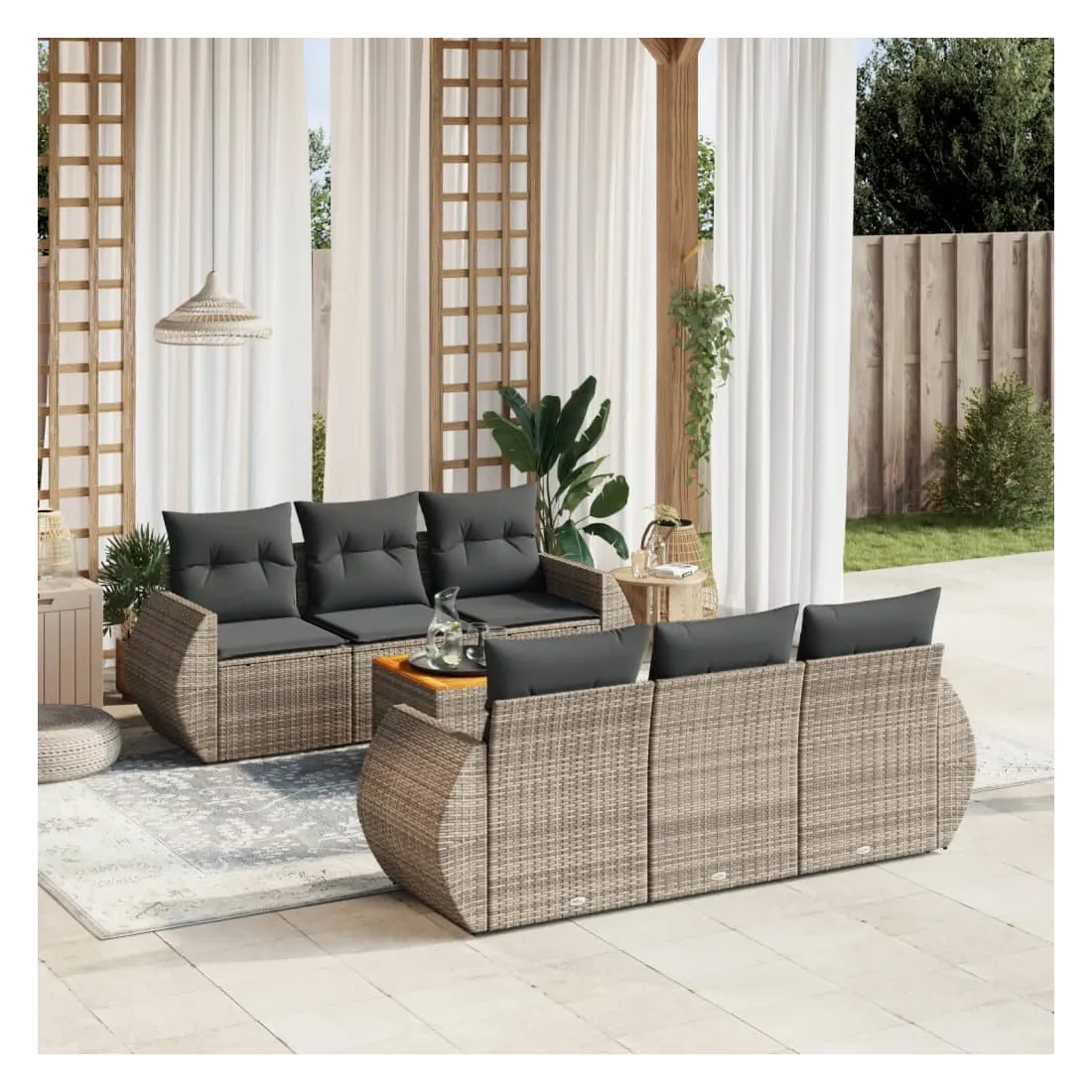 Cet ensemble de canapés de jardin est le complément parfait de votre arrière-cour, terrasse ou patio, offrant un espace confortable et accueillant pour discuter avec la famille et les amis ou simplement se détendre et profiter de l'extérieur. Matériau durable : la résine tressée, également connue sous le nom de poly rotin, est un matériau synthétique solide et nécessitant peu d'entretien qui ressemble au rotin naturel. Il est léger, facile à nettoyer et couramment utilisé pour les meubles d'extérieur en raison de sa durabilité et de ses propriétés de résistance aux intempéries.Dessus stable et facile à nettoyer : cette table de jardin a un dessus en bois d'acacia robuste, durable et facile à nettoyer avec un chiffon humide. Fonction de rangement avec sac résistant à l'eau : chaque siège de jardin dispose d'un espace de rangement sous l'assise, complété par un sac résistant à l'eau pour ranger les coussins, les jouets et d'autres objets. Les sacs intérieurs sont dotés d'un couvercle et peuvent être solidement fixés aux sièges à l'aide de bandes auto-agrippantes pour plus de stabilité.Expérience d'assise confortable : ce mobilier d'extérieur, doté de coussins épais, offre une expérience d'assise confortable.Conception modulaire : cet ensemble de meubles d'extérieur a une conception modulaire, ce qui le rend complètement flexible et facile à déplacer, afin que vous puissiez créer un agencement de meubles d'extérieur personnalisé. Bon à savoir :Pour que vos meubles d'extérieur restent beaux, nous vous recommandons de les protéger avec une housse imperméable.