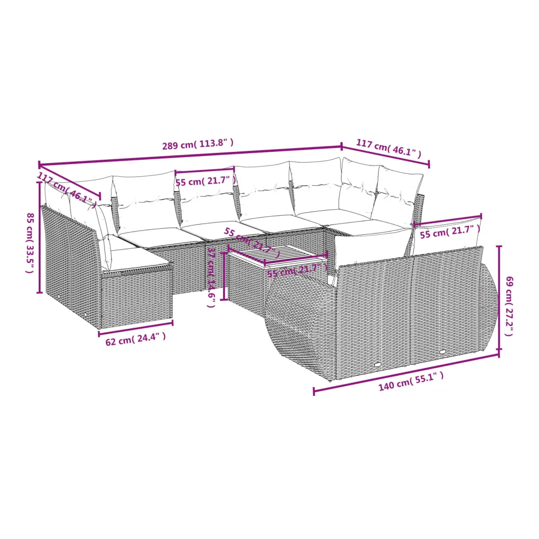 Cet ensemble de canapés de jardin est le complément parfait de votre arrière-cour, terrasse ou patio, offrant un espace confortable et accueillant pour discuter avec la famille et les amis ou simplement se détendre et profiter de l'extérieur. Matériau durable : la résine tressée, également connue sous le nom de poly rotin, est un matériau synthétique solide et nécessitant peu d'entretien qui ressemble au rotin naturel. Il est léger, facile à nettoyer et couramment utilisé pour les meubles d'extérieur en raison de sa durabilité et de ses propriétés de résistance aux intempéries.Dessus stable et facile à nettoyer : cette table de jardin a un dessus en bois d'acacia robuste, durable et facile à nettoyer avec un chiffon humide. Fonction de rangement avec sac résistant à l'eau : chaque siège de jardin dispose d'un espace de rangement sous l'assise, complété par un sac résistant à l'eau pour ranger les coussins, les jouets et d'autres objets. Les sacs intérieurs sont dotés d'un couvercle et peuvent être solidement fixés aux sièges à l'aide de bandes auto-agrippantes pour plus de stabilité.Expérience d'assise confortable : ce mobilier d'extérieur, doté de coussins épais, offre une expérience d'assise confortable.Conception modulaire : cet ensemble de meubles d'extérieur a une conception modulaire, ce qui le rend complètement flexible et facile à déplacer, afin que vous puissiez créer un agencement de meubles d'extérieur personnalisé. Bon à savoir :Pour que vos meubles d'extérieur restent beaux, nous vous recommandons de les protéger avec une housse imperméable.