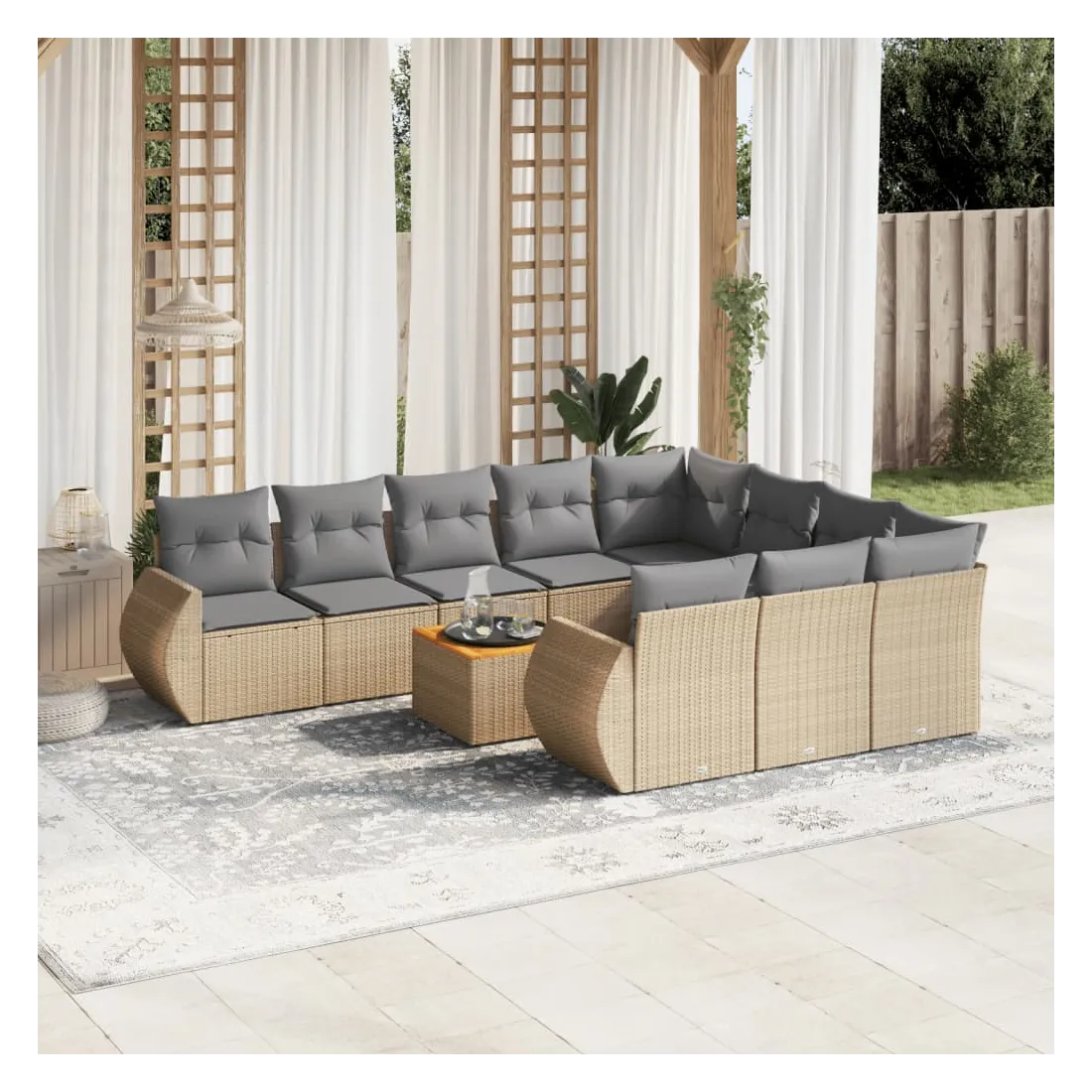 Cet ensemble de canapés de jardin est le complément parfait de votre arrière-cour, terrasse ou patio, offrant un espace confortable et accueillant pour discuter avec la famille et les amis ou simplement se détendre et profiter de l'extérieur. Matériau durable : la résine tressée, également connue sous le nom de poly rotin, est un matériau synthétique solide et nécessitant peu d'entretien qui ressemble au rotin naturel. Il est léger, facile à nettoyer et couramment utilisé pour les meubles d'extérieur en raison de sa durabilité et de ses propriétés de résistance aux intempéries.Dessus stable et facile à nettoyer : cette table de jardin a un dessus en bois d'acacia robuste, durable et facile à nettoyer avec un chiffon humide. Fonction de rangement avec sac résistant à l'eau : chaque siège de jardin dispose d'un espace de rangement sous l'assise, complété par un sac résistant à l'eau pour ranger les coussins, les jouets et d'autres objets. Les sacs intérieurs sont dotés d'un couvercle et peuvent être solidement fixés aux sièges à l'aide de bandes auto-agrippantes pour plus de stabilité.Expérience d'assise confortable : ce mobilier d'extérieur, doté de coussins épais, offre une expérience d'assise confortable.Conception modulaire : cet ensemble de meubles d'extérieur a une conception modulaire, ce qui le rend complètement flexible et facile à déplacer, afin que vous puissiez créer un agencement de meubles d'extérieur personnalisé. Bon à savoir :Pour que vos meubles d'extérieur restent beaux, nous vous recommandons de les protéger avec une housse imperméable.