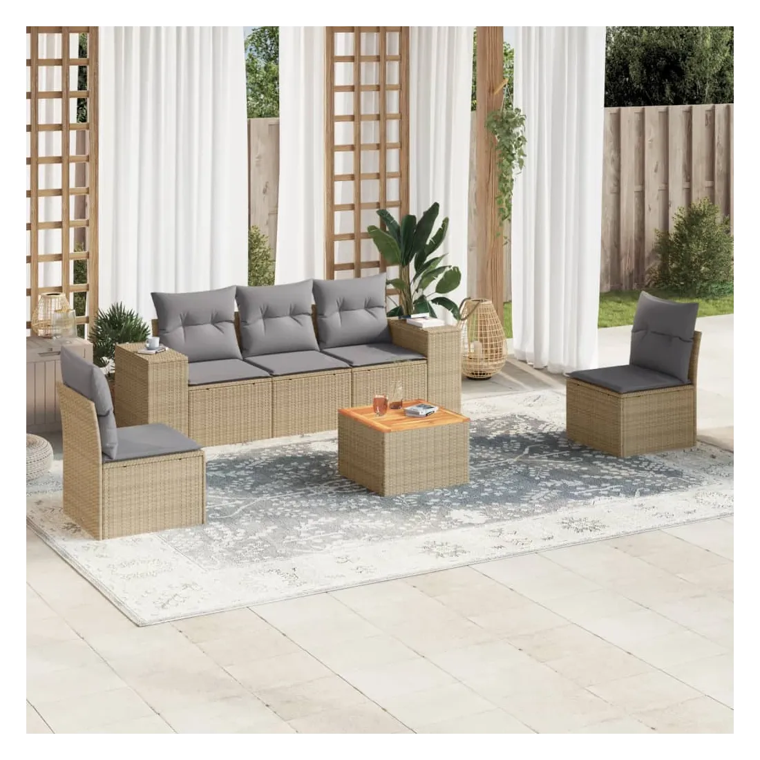 Cet ensemble de canapés de jardin est le complément parfait de votre arrière-cour, terrasse ou patio, offrant un espace confortable et accueillant pour discuter avec la famille et les amis ou simplement se détendre et profiter de l'extérieur. Matériau durable : la résine tressée, également connue sous le nom de poly rotin, est un matériau synthétique solide et nécessitant peu d'entretien qui ressemble au rotin naturel. Il est léger, facile à nettoyer et couramment utilisé pour les meubles d'extérieur en raison de sa durabilité et de ses propriétés de résistance aux intempéries. Fonction de rangement avec sac résistant à l'eau : chaque siège de jardin dispose d'un espace de rangement sous l'assise, complété par un sac résistant à l'eau pour ranger les coussins, les jouets et d'autres objets. Les sacs intérieurs sont dotés d'un couvercle et peuvent être solidement fixés aux sièges à l'aide de bandes auto-agrippantes pour plus de stabilité. Dessus stable et facile à nettoyer : cette table de jardin a un dessus en bois d'acacia robuste, durable et facile à nettoyer avec un chiffon humide. Expérience d'assise confortable : ce mobilier d'extérieur, doté de coussins épais, offre une expérience d'assise confortable. Conception modulaire : cet ensemble de meubles d'extérieur a une conception modulaire, ce qui le rend complètement flexible et facile à déplacer, afin que vous puissiez créer un agencement de meubles d'extérieur personnalisé. Bon à savoir :Pour que vos meubles d'extérieur restent beaux, nous vous recommandons de les protéger avec une housse imperméable.