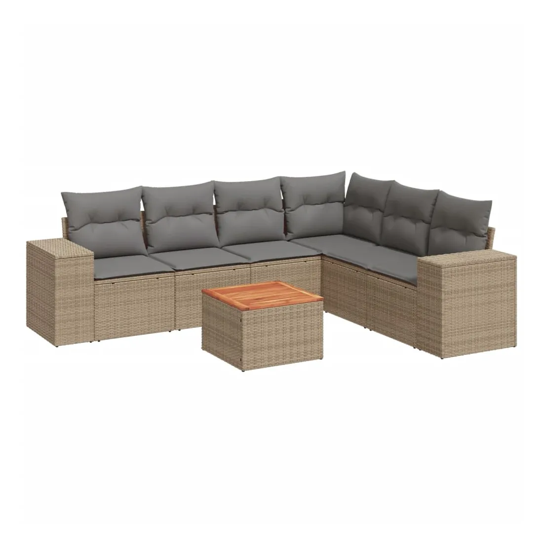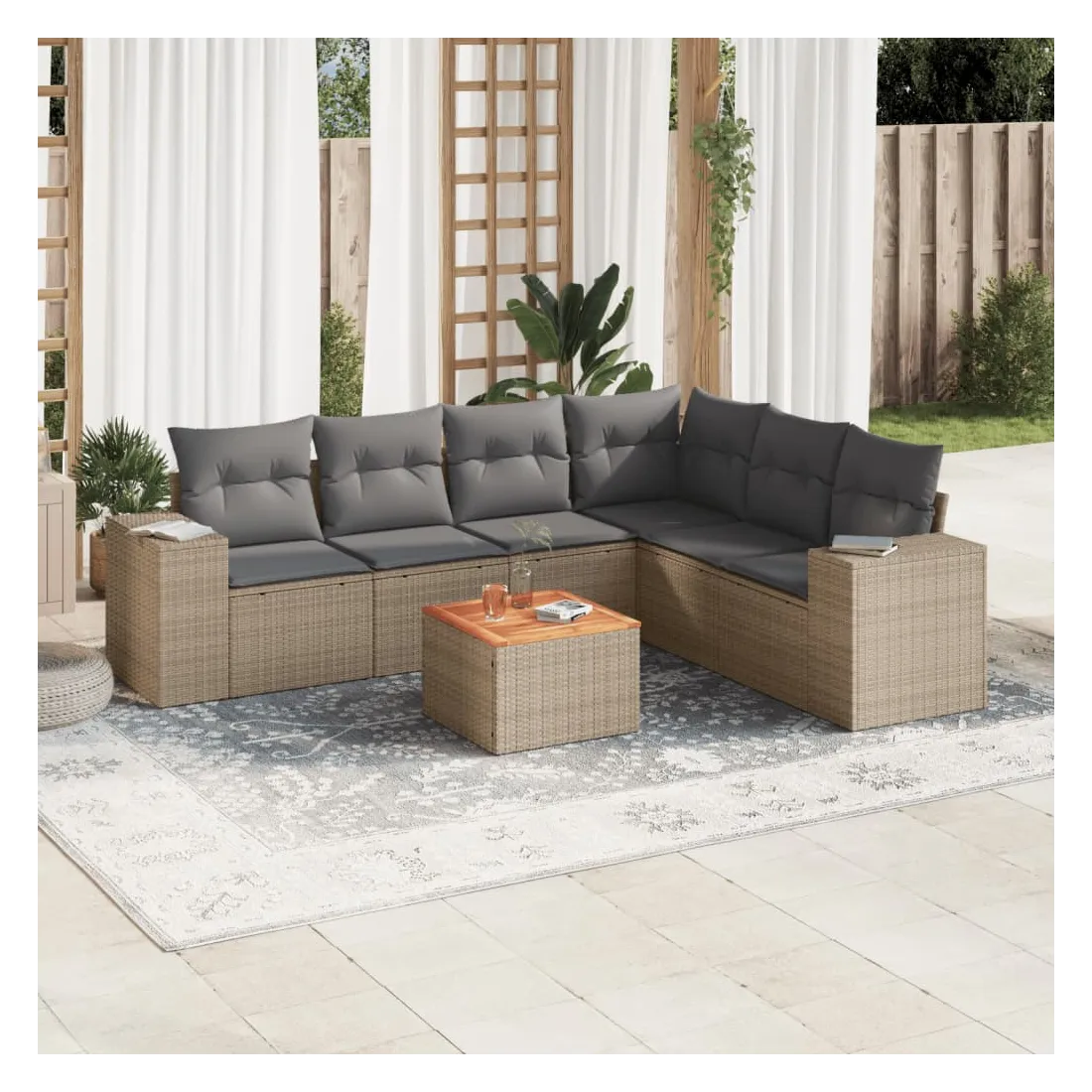Cet ensemble de canapés de jardin est le complément parfait de votre arrière-cour, terrasse ou patio, offrant un espace confortable et accueillant pour discuter avec la famille et les amis ou simplement se détendre et profiter de l'extérieur. Matériau durable : la résine tressée, également connue sous le nom de poly rotin, est un matériau synthétique solide et nécessitant peu d'entretien qui ressemble au rotin naturel. Il est léger, facile à nettoyer et couramment utilisé pour les meubles d'extérieur en raison de sa durabilité et de ses propriétés de résistance aux intempéries. Fonction de rangement avec sac résistant à l'eau : chaque siège de jardin dispose d'un espace de rangement sous l'assise, complété par un sac résistant à l'eau pour ranger les coussins, les jouets et d'autres objets. Les sacs intérieurs sont dotés d'un couvercle et peuvent être solidement fixés aux sièges à l'aide de bandes auto-agrippantes pour plus de stabilité. Dessus stable et facile à nettoyer : cette table de jardin a un dessus en bois d'acacia robuste, durable et facile à nettoyer avec un chiffon humide. Expérience d'assise confortable : ce mobilier d'extérieur, doté de coussins épais, offre une expérience d'assise confortable. Conception modulaire : cet ensemble de meubles d'extérieur a une conception modulaire, ce qui le rend complètement flexible et facile à déplacer, afin que vous puissiez créer un agencement de meubles d'extérieur personnalisé. Bon à savoir :Pour que vos meubles d'extérieur restent beaux, nous vous recommandons de les protéger avec une housse imperméable.