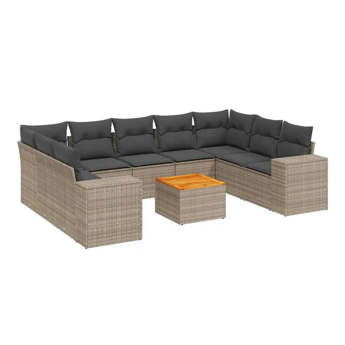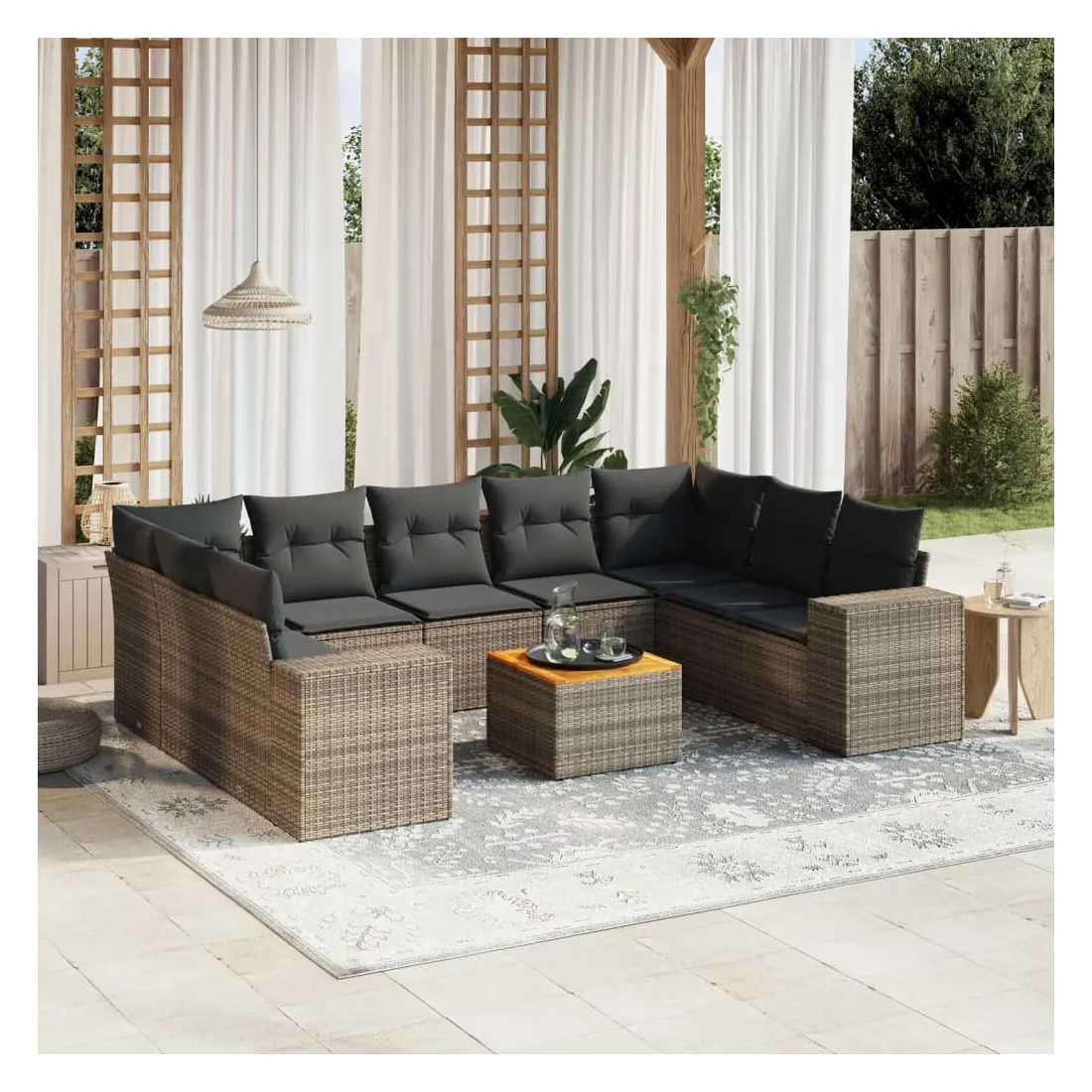 Cet ensemble de canapés de jardin est le complément parfait de votre arrière-cour, terrasse ou patio, offrant un espace confortable et accueillant pour discuter avec la famille et les amis ou simplement se détendre et profiter de l'extérieur. Matériau durable : la résine tressée, également connue sous le nom de poly rotin, est un matériau synthétique solide et nécessitant peu d'entretien qui ressemble au rotin naturel. Il est léger, facile à nettoyer et couramment utilisé pour les meubles d'extérieur en raison de sa durabilité et de ses propriétés de résistance aux intempéries.Dessus stable et facile à nettoyer : cette table de jardin a un dessus en bois d'acacia robuste, durable et facile à nettoyer avec un chiffon humide. Fonction de rangement avec sac résistant à l'eau : chaque siège de jardin dispose d'un espace de rangement sous l'assise, complété par un sac résistant à l'eau pour ranger les coussins, les jouets et d'autres objets. Les sacs intérieurs sont dotés d'un couvercle et peuvent être solidement fixés aux sièges à l'aide de bandes auto-agrippantes pour plus de stabilité.Expérience d'assise confortable : ce mobilier d'extérieur, doté de coussins épais, offre une expérience d'assise confortable.Conception modulaire : cet ensemble de meubles d'extérieur a une conception modulaire, ce qui le rend complètement flexible et facile à déplacer, afin que vous puissiez créer un agencement de meubles d'extérieur personnalisé. Bon à savoir :Pour que vos meubles d'extérieur restent beaux, nous vous recommandons de les protéger avec une housse imperméable.
