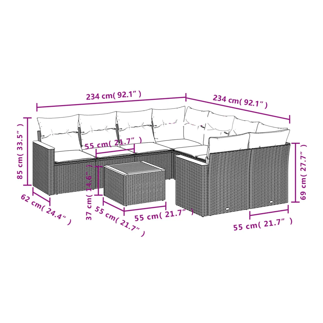 - Dimensions du coussin de siège : 55 x 55 x 3 cm (l x P x é)