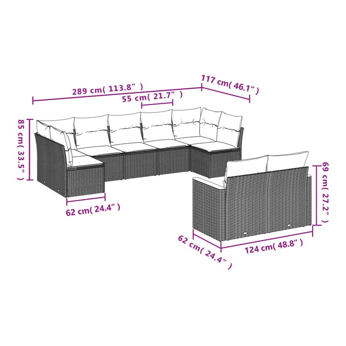 - 9 x coussin d'assise avec housse amovible et lavable