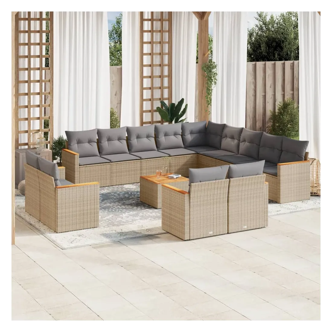 Cet ensemble de canapés de jardin est le complément parfait de votre arrière-cour, terrasse ou patio, offrant un espace confortable et accueillant pour discuter avec la famille et les amis ou simplement se détendre et profiter de l'extérieur. Matériau durable : la résine tressée, également connue sous le nom de poly rotin, est un matériau synthétique solide et nécessitant peu d'entretien qui ressemble au rotin naturel. Il est léger, facile à nettoyer et couramment utilisé pour les meubles d'extérieur en raison de sa durabilité et de ses propriétés de résistance aux intempéries.Fonction de rangement avec sac résistant à l'eau : le mobilier de jardin dispose d'un espace de rangement sous l'assise, complété par un sac résistant à l'eau pour ranger coussins, jouets et autres objets. Le sac intérieur peut être solidement fixé au mobilier d'extérieur grâce à des attaches auto-agrippantes pour plus de stabilité.Dessus stable et facile à nettoyer : cette table de jardin a un dessus en bois d'acacia robuste, durable et facile à nettoyer avec un chiffon humide.Housse amovible et lavable : ces coussins de siège sont dotés de housses amovibles pour un lavage et un entretien faciles.Conception modulaire : cet ensemble de meubles d'extérieur a une conception modulaire, ce qui le rend complètement flexible et facile à déplacer, afin que vous puissiez créer un agencement de meubles d'extérieur personnalisé. Bon à savoir :Pour que vos meubles d'extérieur restent beaux, nous vous recommandons de les protéger avec une housse imperméable.
