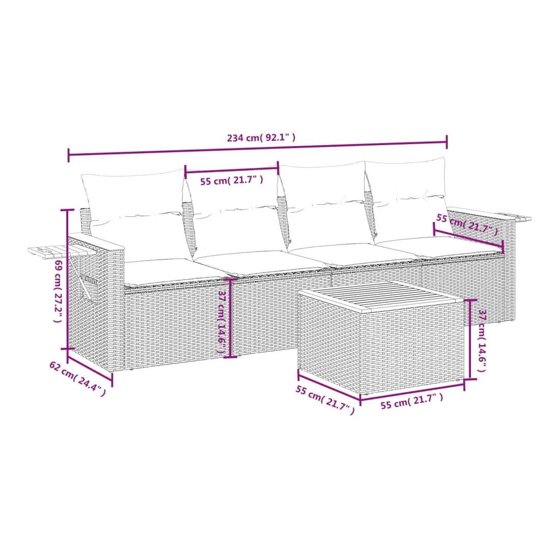 Cet ensemble de canapés de jardin est le complément parfait de votre arrière-cour, terrasse ou patio, offrant un espace confortable et accueillant pour discuter avec la famille et les amis ou simplement se détendre et profiter de l'extérieur. Matériau durable : la résine tressée, également connue sous le nom de poly rotin, est un matériau synthétique solide et nécessitant peu d'entretien qui ressemble au rotin naturel. Il est léger, facile à nettoyer et couramment utilisé pour les meubles d'extérieur en raison de sa durabilité et de ses propriétés de résistance aux intempéries.Fonction de rangement avec sac résistant à l'eau : le mobilier de jardin dispose d'un espace de rangement sous l'assise, complété par un sac résistant à l'eau pour ranger coussins, jouets et autres objets. Le sac intérieur peut être solidement fixé au mobilier d'extérieur grâce à des attaches auto-agrippantes pour plus de stabilité.Table d'appoint pratique : ce mobilier d'extérieur comprend une table d'appoint pliable avec un ressort à gaz sur les accoudoirs, offrant un endroit pratique pour garder vos essentiels à portée de main.Housse amovible et lavable : ces coussins de siège sont dotés de housses amovibles pour un lavage et un entretien faciles.Conception modulaire : cet ensemble de meubles d'extérieur a une conception modulaire, ce qui le rend complètement flexible et facile à déplacer, afin que vous puissiez créer un agencement de meubles d'extérieur personnalisé. Bon à savoir :Pour que vos meubles d'extérieur restent beaux, nous vous recommandons de les protéger avec une housse imperméable.