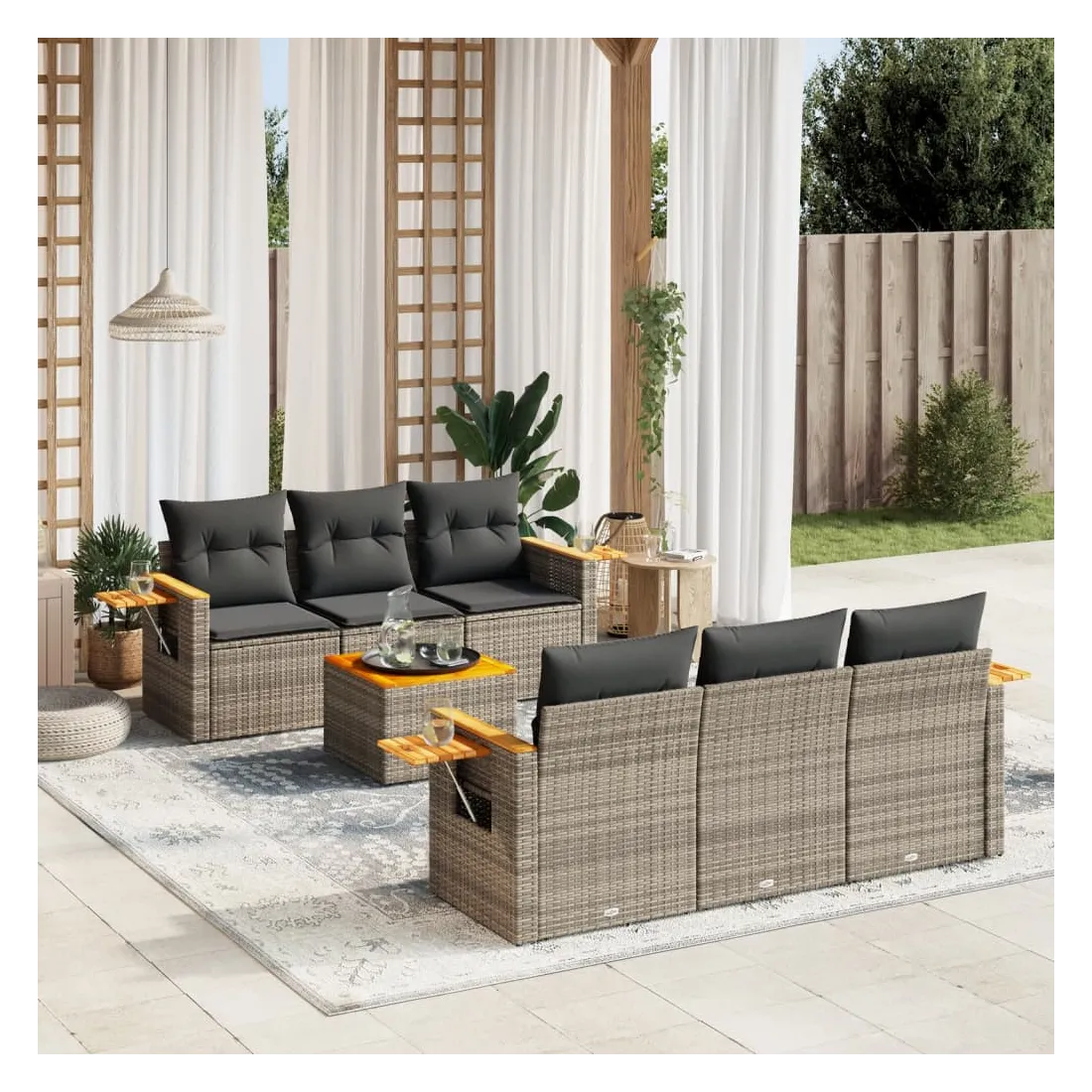 Cet ensemble de canapés de jardin est le complément parfait de votre arrière-cour, terrasse ou patio, offrant un espace confortable et accueillant pour discuter avec la famille et les amis ou simplement se détendre et profiter de l'extérieur. Matériau durable : la résine tressée, également connue sous le nom de poly rotin, est un matériau synthétique solide et nécessitant peu d'entretien qui ressemble au rotin naturel. Il est léger, facile à nettoyer et couramment utilisé pour les meubles d'extérieur en raison de sa durabilité et de ses propriétés de résistance aux intempéries.Fonction de rangement avec sac résistant à l'eau : le mobilier de jardin dispose d'un espace de rangement sous l'assise, complété par un sac résistant à l'eau pour ranger coussins, jouets et autres objets. Le sac intérieur peut être solidement fixé au mobilier d'extérieur grâce à des attaches auto-agrippantes pour plus de stabilité.Table d'appoint pratique : ce mobilier d'extérieur comprend une table d'appoint pliable avec un ressort à gaz sur les accoudoirs, offrant un endroit pratique pour garder vos essentiels à portée de main.Housse amovible et lavable : ces coussins de siège sont dotés de housses amovibles pour un lavage et un entretien faciles.Conception modulaire : cet ensemble de meubles d'extérieur a une conception modulaire, ce qui le rend complètement flexible et facile à déplacer, afin que vous puissiez créer un agencement de meubles d'extérieur personnalisé. Bon à savoir :Pour que vos meubles d'extérieur restent beaux, nous vous recommandons de les protéger avec une housse imperméable.