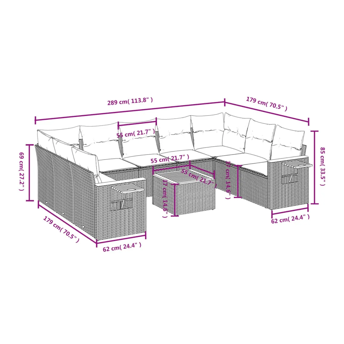 Cet ensemble de canapés de jardin est le complément parfait de votre arrière-cour, terrasse ou patio, offrant un espace confortable et accueillant pour discuter avec la famille et les amis ou simplement se détendre et profiter de l'extérieur. Matériau durable : la résine tressée, également connue sous le nom de poly rotin, est un matériau synthétique solide et nécessitant peu d'entretien qui ressemble au rotin naturel. Il est léger, facile à nettoyer et couramment utilisé pour les meubles d'extérieur en raison de sa durabilité et de ses propriétés de résistance aux intempéries.Fonction de rangement avec sac résistant à l'eau : le mobilier de jardin dispose d'un espace de rangement sous l'assise, complété par un sac résistant à l'eau pour ranger coussins, jouets et autres objets. Le sac intérieur peut être solidement fixé au mobilier d'extérieur grâce à des attaches auto-agrippantes pour plus de stabilité.Table d'appoint pratique : ce mobilier d'extérieur comprend une table d'appoint pliable avec un ressort à gaz sur les accoudoirs, offrant un endroit pratique pour garder vos essentiels à portée de main.Housse amovible et lavable : ces coussins de siège sont dotés de housses amovibles pour un lavage et un entretien faciles.Conception modulaire : cet ensemble de meubles d'extérieur a une conception modulaire, ce qui le rend complètement flexible et facile à déplacer, afin que vous puissiez créer un agencement de meubles d'extérieur personnalisé. Bon à savoir :Pour que vos meubles d'extérieur restent beaux, nous vous recommandons de les protéger avec une housse imperméable.