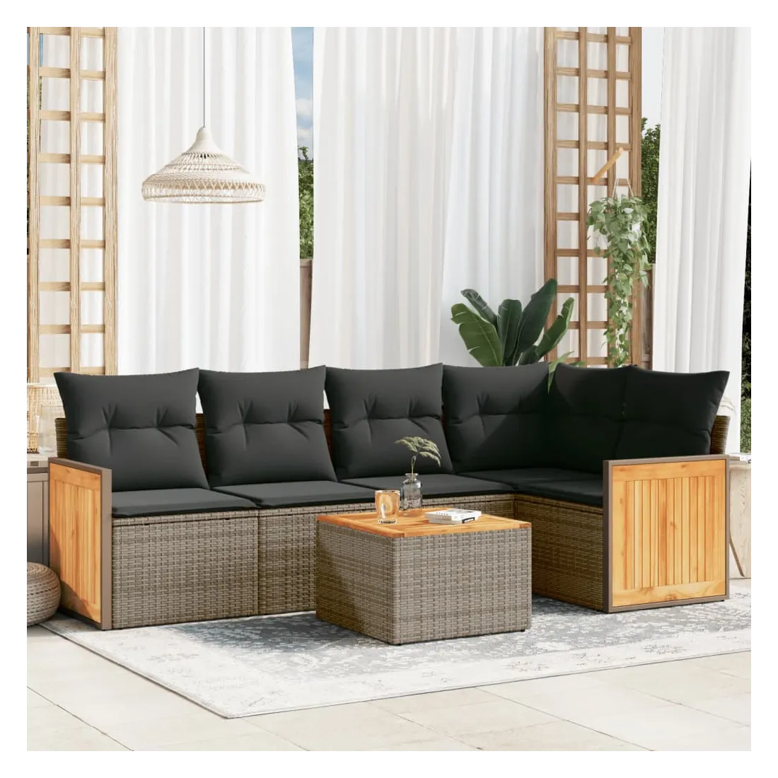 Cet ensemble de canapés de jardin est le complément parfait de votre arrière-cour, terrasse ou patio, offrant un espace confortable et accueillant pour discuter avec la famille et les amis ou simplement se détendre et profiter de l'extérieur. Matériau durable : la résine tressée, également connue sous le nom de poly rotin, est un matériau synthétique solide et nécessitant peu d'entretien qui ressemble au rotin naturel. Il est léger, facile à nettoyer et couramment utilisé pour les meubles d'extérieur en raison de sa durabilité et de ses propriétés de résistance aux intempéries.Fonction de rangement avec sac résistant à l'eau : le mobilier de jardin dispose d'un espace de rangement sous l'assise, complété par un sac résistant à l'eau pour ranger coussins, jouets et autres objets. Le sac intérieur peut être solidement fixé au mobilier d'extérieur grâce à des attaches auto-agrippantes pour plus de stabilité.Dessus stable et facile à nettoyer : cette table de jardin a un dessus en bois d'acacia robuste, durable et facile à nettoyer avec un chiffon humide.Housse amovible et lavable : ces coussins de siège sont dotés de housses amovibles pour un lavage et un entretien faciles.Conception modulaire : cet ensemble de meubles d'extérieur a une conception modulaire, ce qui le rend complètement flexible et facile à déplacer, afin que vous puissiez créer un agencement de meubles d'extérieur personnalisé. Bon à savoir :Pour que vos meubles d'extérieur restent beaux, nous vous recommandons de les protéger avec une housse imperméable.