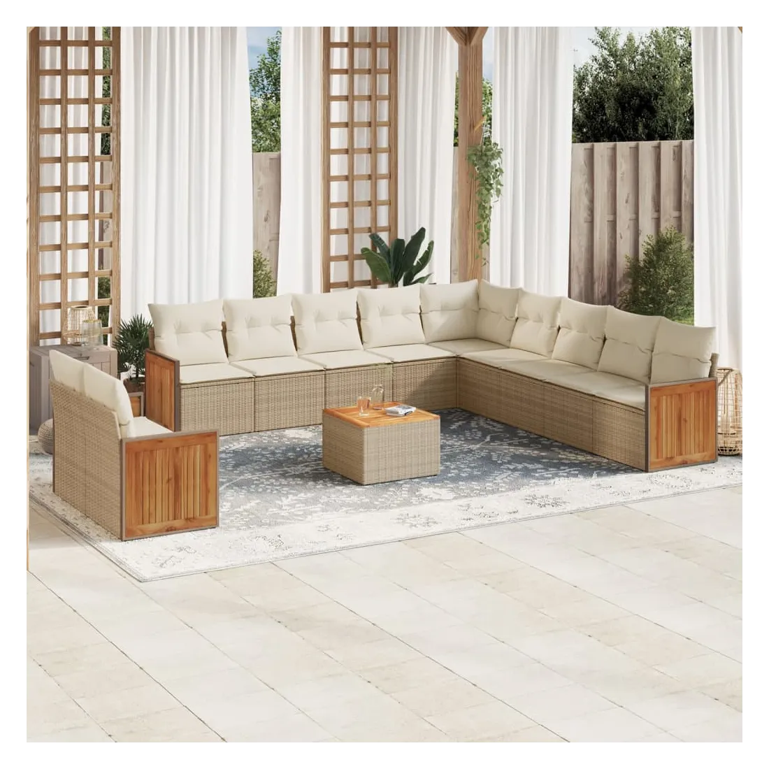 Cet ensemble de canapés de jardin est le complément parfait de votre arrière-cour, terrasse ou patio, offrant un espace confortable et accueillant pour discuter avec la famille et les amis ou simplement se détendre et profiter de l'extérieur. Matériau durable : la résine tressée, également connue sous le nom de poly rotin, est un matériau synthétique solide et nécessitant peu d'entretien qui ressemble au rotin naturel. Il est léger, facile à nettoyer et couramment utilisé pour les meubles d'extérieur en raison de sa durabilité et de ses propriétés de résistance aux intempéries.Fonction de rangement avec sac résistant à l'eau : le mobilier de jardin dispose d'un espace de rangement sous l'assise, complété par un sac résistant à l'eau pour ranger coussins, jouets et autres objets. Le sac intérieur peut être solidement fixé au mobilier d'extérieur grâce à des attaches auto-agrippantes pour plus de stabilité.Dessus stable et facile à nettoyer : cette table de jardin a un dessus en bois d'acacia robuste, durable et facile à nettoyer avec un chiffon humide.Housse amovible et lavable : ces coussins de siège sont dotés de housses amovibles pour un lavage et un entretien faciles.Conception modulaire : cet ensemble de meubles d'extérieur a une conception modulaire, ce qui le rend complètement flexible et facile à déplacer, afin que vous puissiez créer un agencement de meubles d'extérieur personnalisé. Bon à savoir :Pour que vos meubles d'extérieur restent beaux, nous vous recommandons de les protéger avec une housse imperméable.