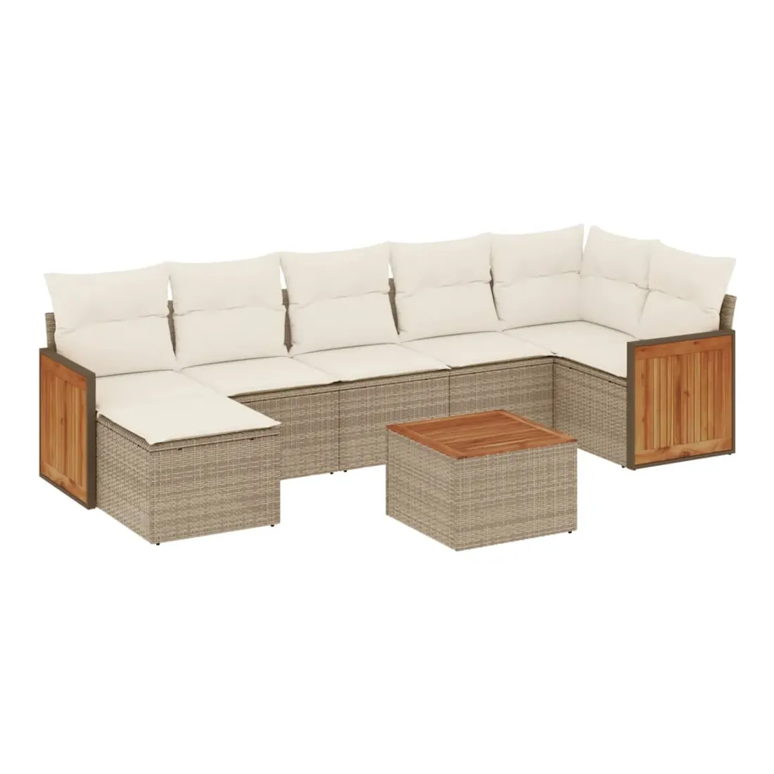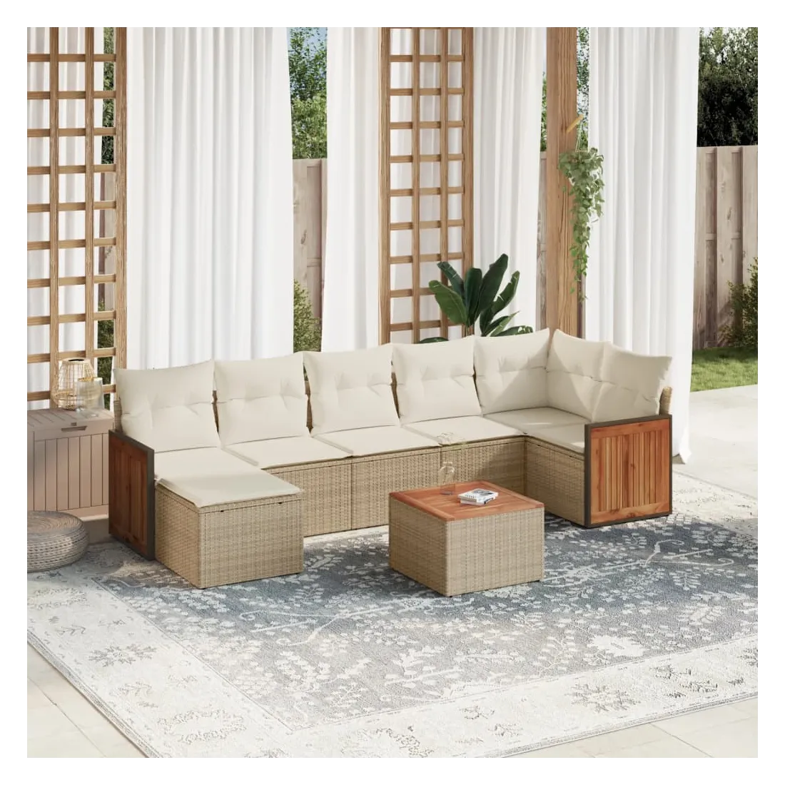 Cet ensemble de canapés de jardin est le complément parfait de votre arrière-cour, terrasse ou patio, offrant un espace confortable et accueillant pour discuter avec la famille et les amis ou simplement se détendre et profiter de l'extérieur. Matériau durable : la résine tressée, également connue sous le nom de poly rotin, est un matériau synthétique solide et nécessitant peu d'entretien qui ressemble au rotin naturel. Il est léger, facile à nettoyer et couramment utilisé pour les meubles d'extérieur en raison de sa durabilité et de ses propriétés de résistance aux intempéries.Fonction de rangement avec sac résistant à l'eau : le mobilier de jardin dispose d'un espace de rangement sous l'assise, complété par un sac résistant à l'eau pour ranger coussins, jouets et autres objets. Le sac intérieur peut être solidement fixé au mobilier d'extérieur grâce à des attaches auto-agrippantes pour plus de stabilité.Dessus stable et facile à nettoyer : cette table de jardin a un dessus en bois d'acacia robuste, durable et facile à nettoyer avec un chiffon humide.Housse amovible et lavable : ces coussins de siège sont dotés de housses amovibles pour un lavage et un entretien faciles.Conception modulaire : cet ensemble de meubles d'extérieur a une conception modulaire, ce qui le rend complètement flexible et facile à déplacer, afin que vous puissiez créer un agencement de meubles d'extérieur personnalisé. Bon à savoir :Pour que vos meubles d'extérieur restent beaux, nous vous recommandons de les protéger avec une housse imperméable.