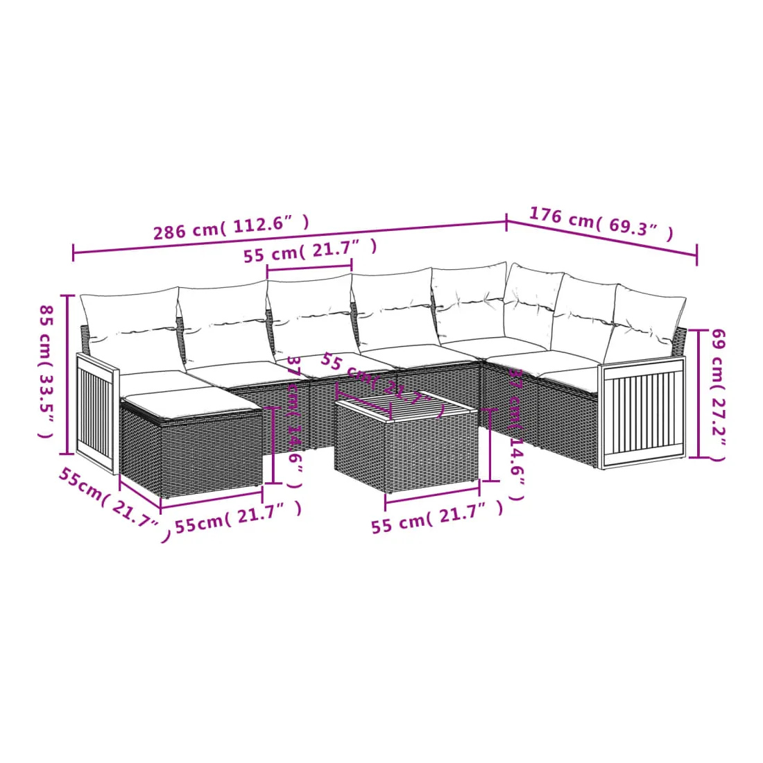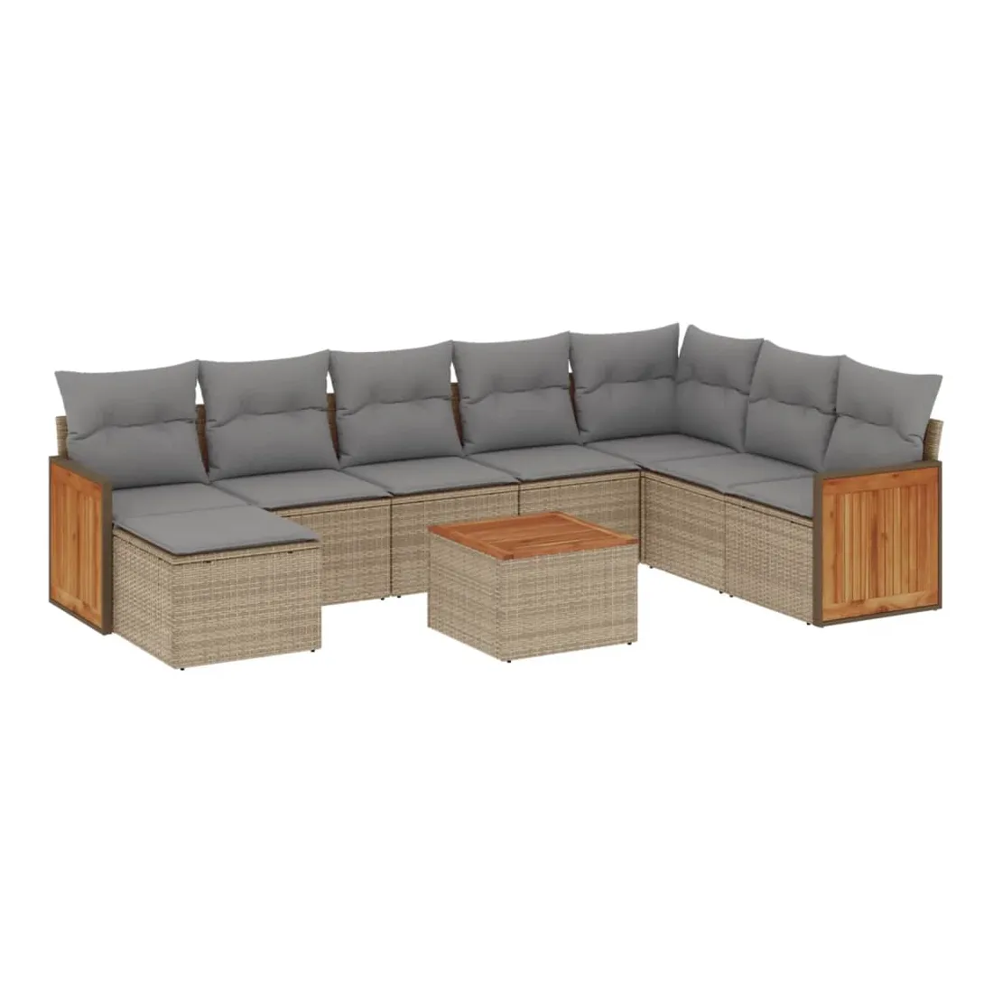 Cet ensemble de canapés de jardin est le complément parfait de votre arrière-cour, terrasse ou patio, offrant un espace confortable et accueillant pour discuter avec la famille et les amis ou simplement se détendre et profiter de l'extérieur. Matériau durable : la résine tressée, également connue sous le nom de poly rotin, est un matériau synthétique solide et nécessitant peu d'entretien qui ressemble au rotin naturel. Il est léger, facile à nettoyer et couramment utilisé pour les meubles d'extérieur en raison de sa durabilité et de ses propriétés de résistance aux intempéries.Fonction de rangement avec sac résistant à l'eau : le mobilier de jardin dispose d'un espace de rangement sous l'assise, complété par un sac résistant à l'eau pour ranger coussins, jouets et autres objets. Le sac intérieur peut être solidement fixé au mobilier d'extérieur grâce à des attaches auto-agrippantes pour plus de stabilité.Dessus stable et facile à nettoyer : cette table de jardin a un dessus en bois d'acacia robuste, durable et facile à nettoyer avec un chiffon humide.Housse amovible et lavable : ces coussins de siège sont dotés de housses amovibles pour un lavage et un entretien faciles.Conception modulaire : cet ensemble de meubles d'extérieur a une conception modulaire, ce qui le rend complètement flexible et facile à déplacer, afin que vous puissiez créer un agencement de meubles d'extérieur personnalisé. Bon à savoir :Pour que vos meubles d'extérieur restent beaux, nous vous recommandons de les protéger avec une housse imperméable.