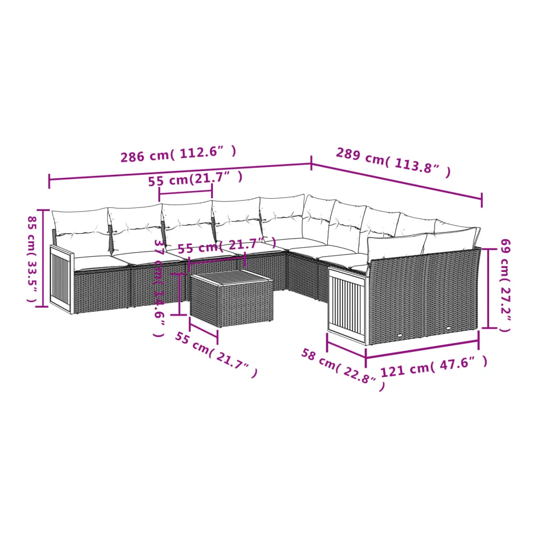 • Dimensions du coussin de siège : 55 x 55 x 3 cm (l x P x é)