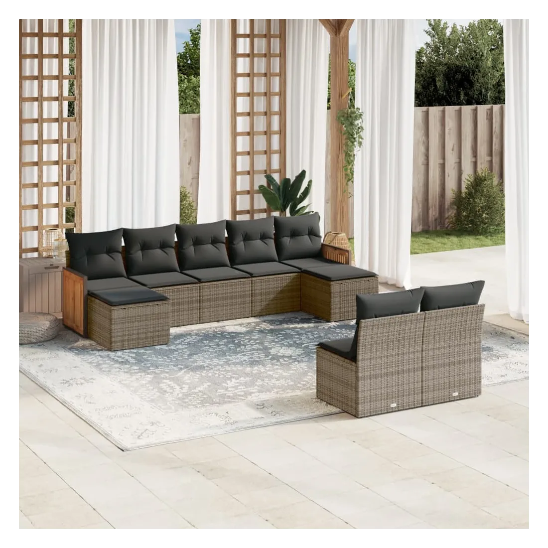 Cet ensemble de canapés de jardin est le complément parfait de votre arrière-cour, terrasse ou patio, offrant un espace confortable et accueillant pour discuter avec la famille et les amis ou simplement se détendre et profiter de l'extérieur. Matériau durable : la résine tressée, également connue sous le nom de poly rotin, est un matériau synthétique solide et nécessitant peu d'entretien qui ressemble au rotin naturel. Il est léger, facile à nettoyer et couramment utilisé pour les meubles d'extérieur en raison de sa durabilité et de ses propriétés de résistance aux intempéries.Fonction de rangement avec sac résistant à l'eau : le mobilier de jardin dispose d'un espace de rangement sous l'assise, complété par un sac résistant à l'eau pour ranger coussins, jouets et autres objets. Le sac intérieur peut être solidement fixé au mobilier d'extérieur grâce à des attaches auto-agrippantes pour plus de stabilité.Housse amovible et lavable : ces coussins de siège sont dotés de housses amovibles pour un lavage et un entretien faciles.Conception modulaire : cet ensemble de meubles d'extérieur a une conception modulaire, ce qui le rend complètement flexible et facile à déplacer, afin que vous puissiez créer un agencement de meubles d'extérieur personnalisé. Bon à savoir :Pour que vos meubles d'extérieur restent beaux, nous vous recommandons de les protéger avec une housse imperméable.