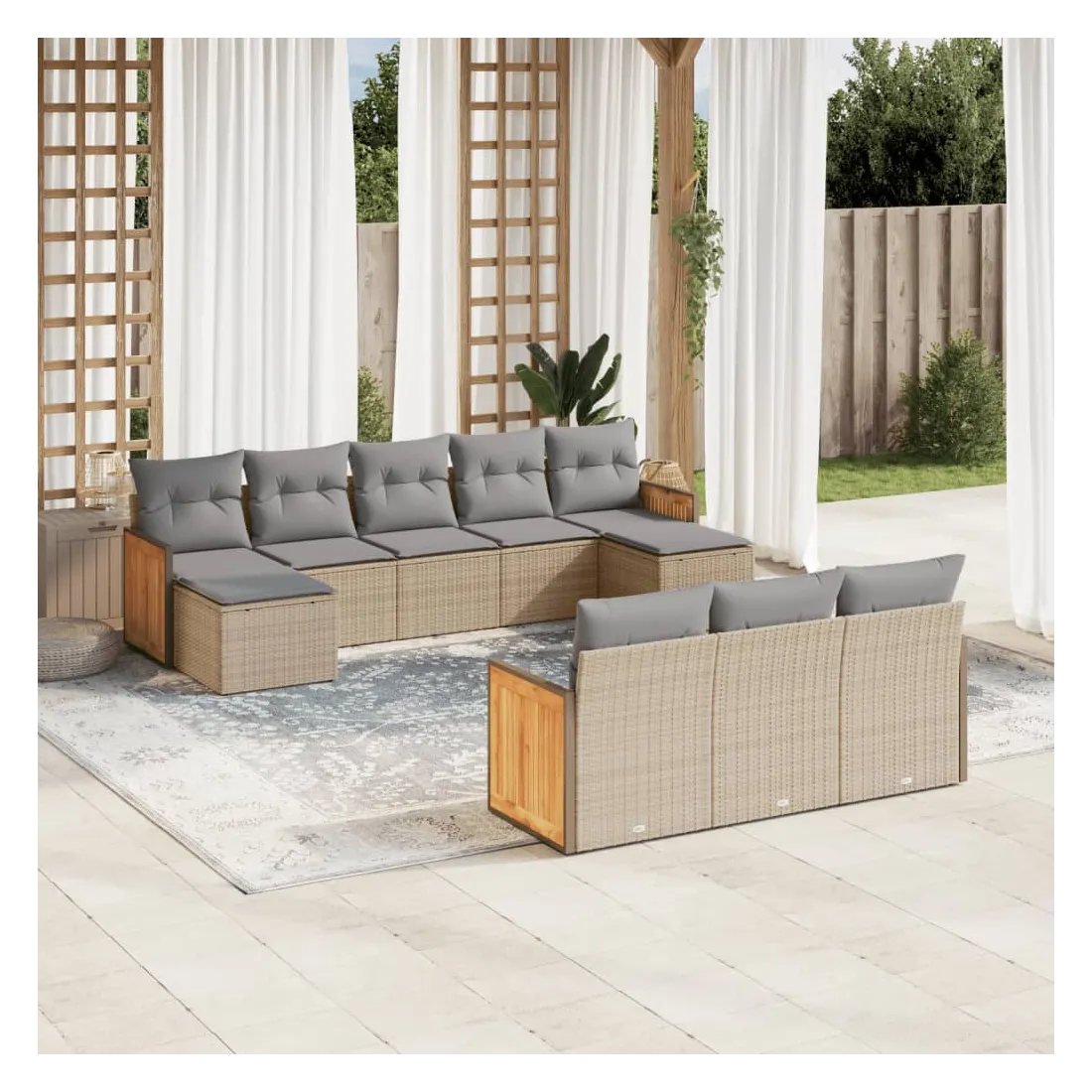 Cet ensemble de canapés de jardin est le complément parfait de votre arrière-cour, terrasse ou patio, offrant un espace confortable et accueillant pour discuter avec la famille et les amis ou simplement se détendre et profiter de l'extérieur. Matériau durable : la résine tressée, également connue sous le nom de poly rotin, est un matériau synthétique solide et nécessitant peu d'entretien qui ressemble au rotin naturel. Il est léger, facile à nettoyer et couramment utilisé pour les meubles d'extérieur en raison de sa durabilité et de ses propriétés de résistance aux intempéries.Fonction de rangement avec sac résistant à l'eau : le mobilier de jardin dispose d'un espace de rangement sous l'assise, complété par un sac résistant à l'eau pour ranger coussins, jouets et autres objets. Le sac intérieur peut être solidement fixé au mobilier d'extérieur grâce à des attaches auto-agrippantes pour plus de stabilité.Housse amovible et lavable : ces coussins de siège sont dotés de housses amovibles pour un lavage et un entretien faciles.Conception modulaire : cet ensemble de meubles d'extérieur a une conception modulaire, ce qui le rend complètement flexible et facile à déplacer, afin que vous puissiez créer un agencement de meubles d'extérieur personnalisé. Bon à savoir :Pour que vos meubles d'extérieur restent beaux, nous vous recommandons de les protéger avec une housse imperméable.