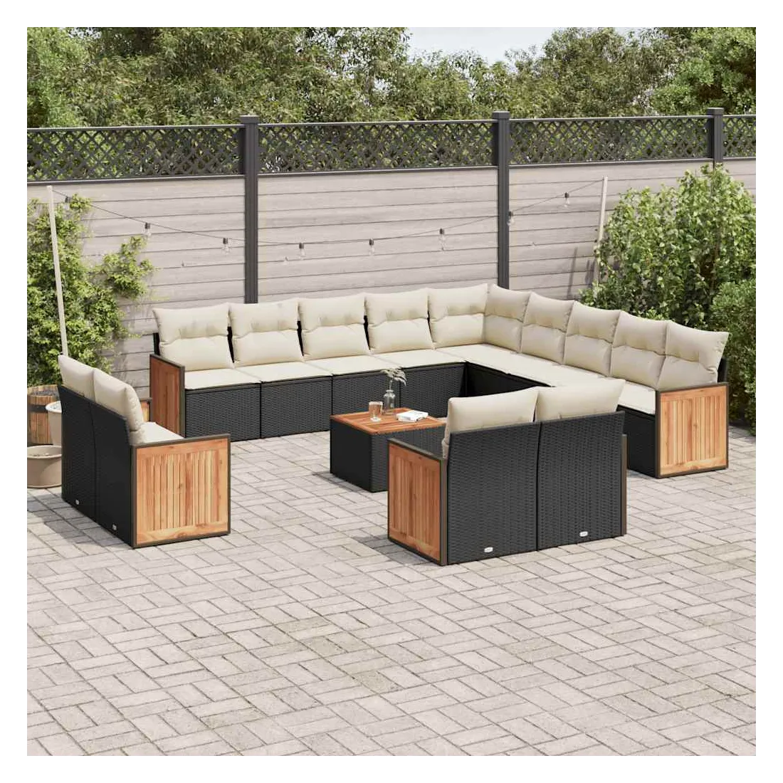 Cet ensemble de canapés de jardin est le complément parfait de votre arrière-cour, terrasse ou patio, offrant un espace confortable et accueillant pour discuter avec la famille et les amis ou simplement se détendre et profiter de l'extérieur. Matériau durable : la résine tressée, également connue sous le nom de poly rotin, est un matériau synthétique solide et nécessitant peu d'entretien qui ressemble au rotin naturel. Il est léger, facile à nettoyer et couramment utilisé pour les meubles d'extérieur en raison de sa durabilité et de ses propriétés de résistance aux intempéries.Fonction de rangement avec sac résistant à l'eau : le mobilier de jardin dispose d'un espace de rangement sous l'assise, complété par un sac résistant à l'eau pour ranger coussins, jouets et autres objets. Le sac intérieur peut être solidement fixé au mobilier d'extérieur grâce à des attaches auto-agrippantes pour plus de stabilité.Dessus stable et facile à nettoyer : cette table de jardin a un dessus en bois d'acacia robuste, durable et facile à nettoyer avec un chiffon humide.Housse amovible et lavable : ces coussins de siège sont dotés de housses amovibles pour un lavage et un entretien faciles.Conception modulaire : cet ensemble de meubles d'extérieur a une conception modulaire, ce qui le rend complètement flexible et facile à déplacer, afin que vous puissiez créer un agencement de meubles d'extérieur personnalisé. Bon à savoir :Pour que vos meubles d'extérieur restent beaux, nous vous recommandons de les protéger avec une housse imperméable.
