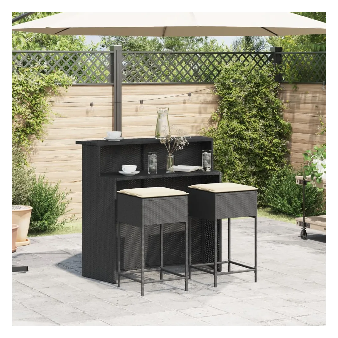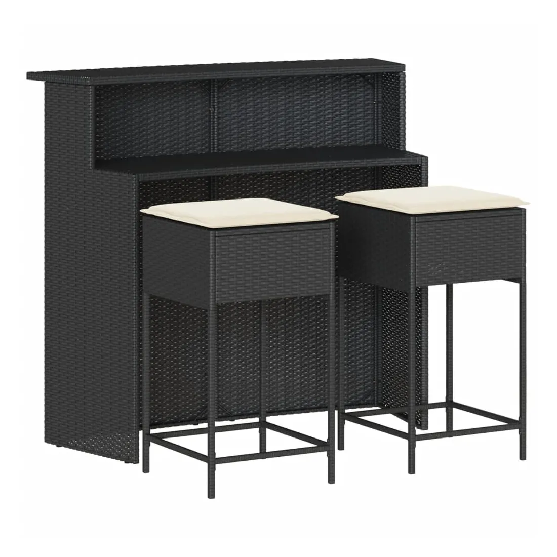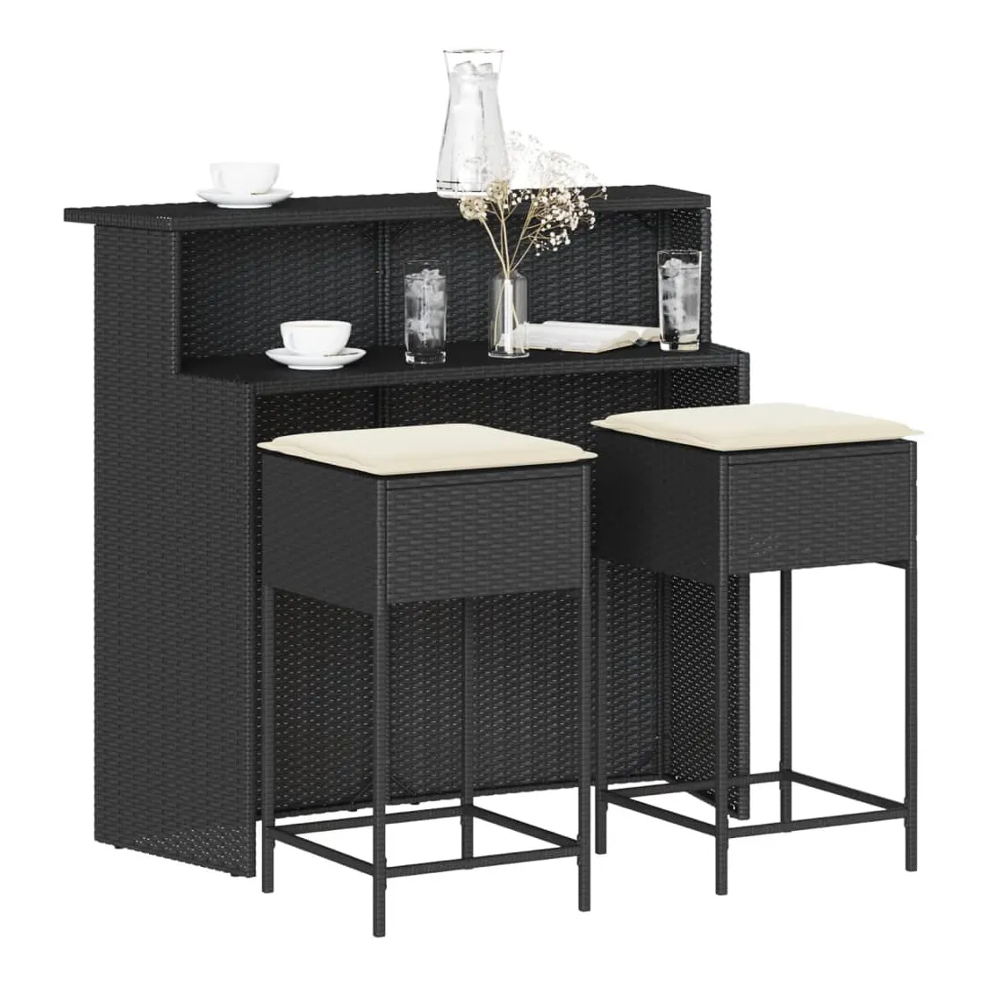 Ensemble de bar de jardin 3 pcs avec coussins noir poly rotin