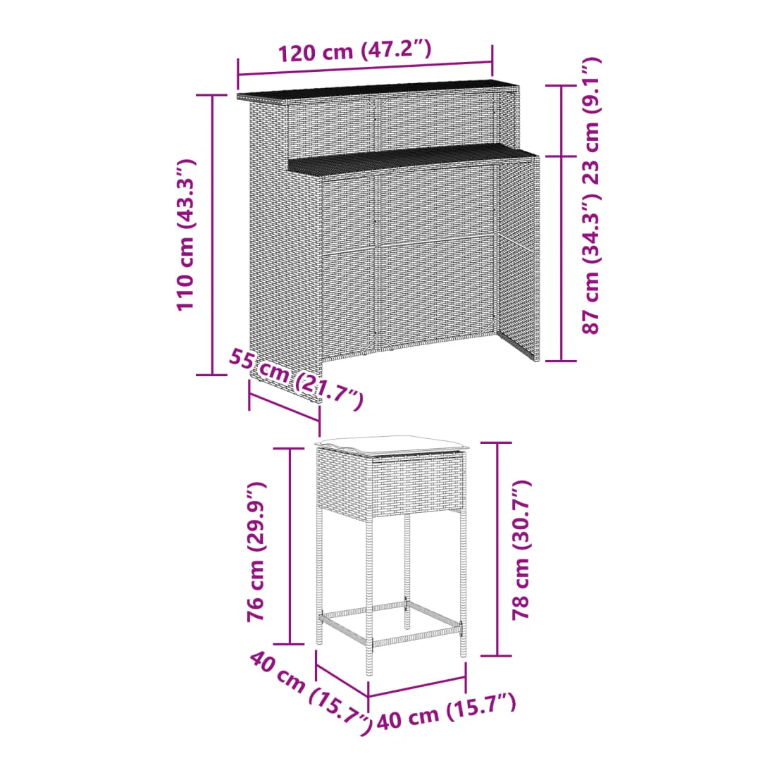 vidaXLCet ensemble de bar de jardin tendance, combinant à la fois style et fonctionnalité, est sûrement destiné à être la pièce maîtresse de votre jardin, terrasse et de tout autre espace de vie. Matériau durable : la résine tressée, également connue sous le nom de poly rotin, est un matériau synthétique solide et nécessitant peu d'entretien qui ressemble au rotin naturel. Elle est légère, facile à nettoyer et couramment utilisée pour les meubles d'extérieur en raison de sa durabilité et de ses propriétés de résistance aux intempéries.Expérience d'assise confortable : ce mobilier d'extérieur, doté de coussins épais, offre une expérience d'assise confortable.Housse amovible et lavable : ces coussins de siège sont dotés de housses amovibles pour un lavage et un entretien faciles.Cadre robuste et stable : le cadre en acier enduit de poudre assure la solidité et la stabilité du meuble de jardin pour une utilisation quotidienne à l'extérieur. Bon à savoir :Pour que vos meubles d'extérieur restent beaux, nous vous recommandons de les protéger avec une housse imperméable.