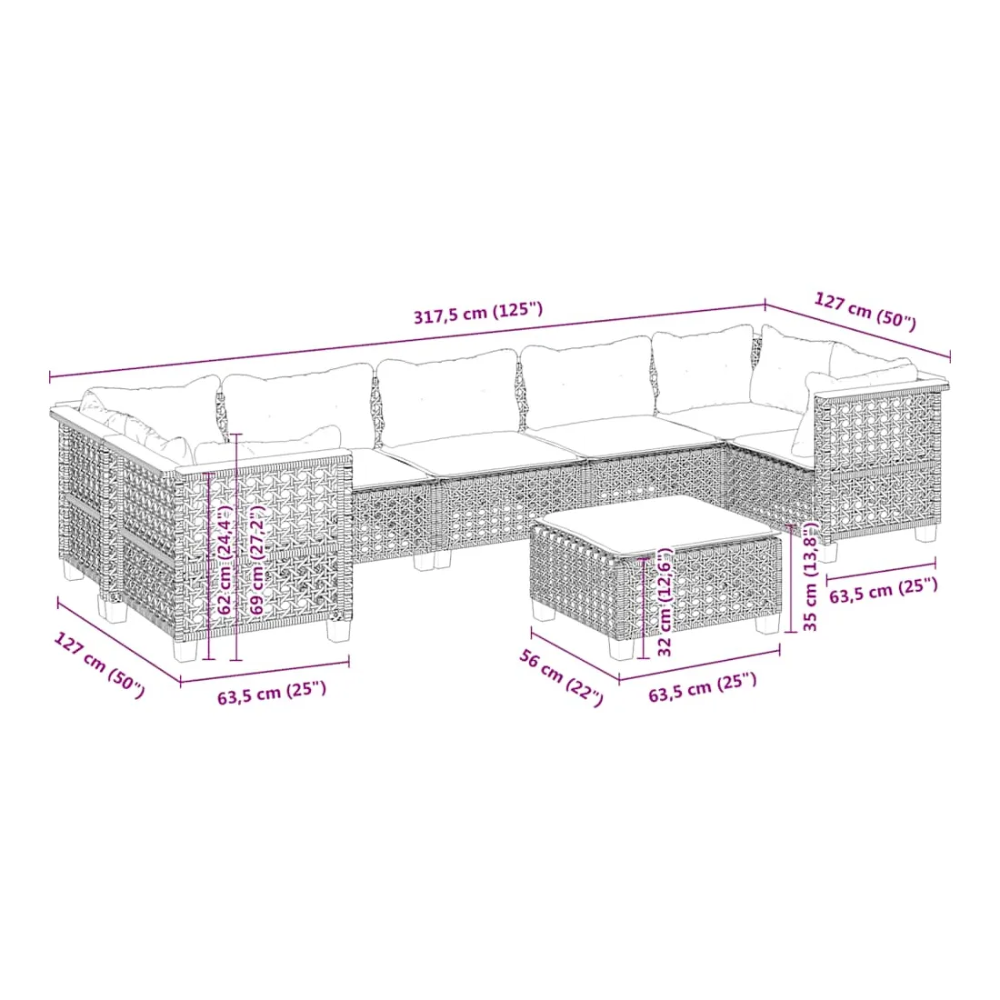 - Dimensions du coussin d’assise (centre/repose-pieds) : 63,5 x 56,5 x 3 cm (l x P x é)