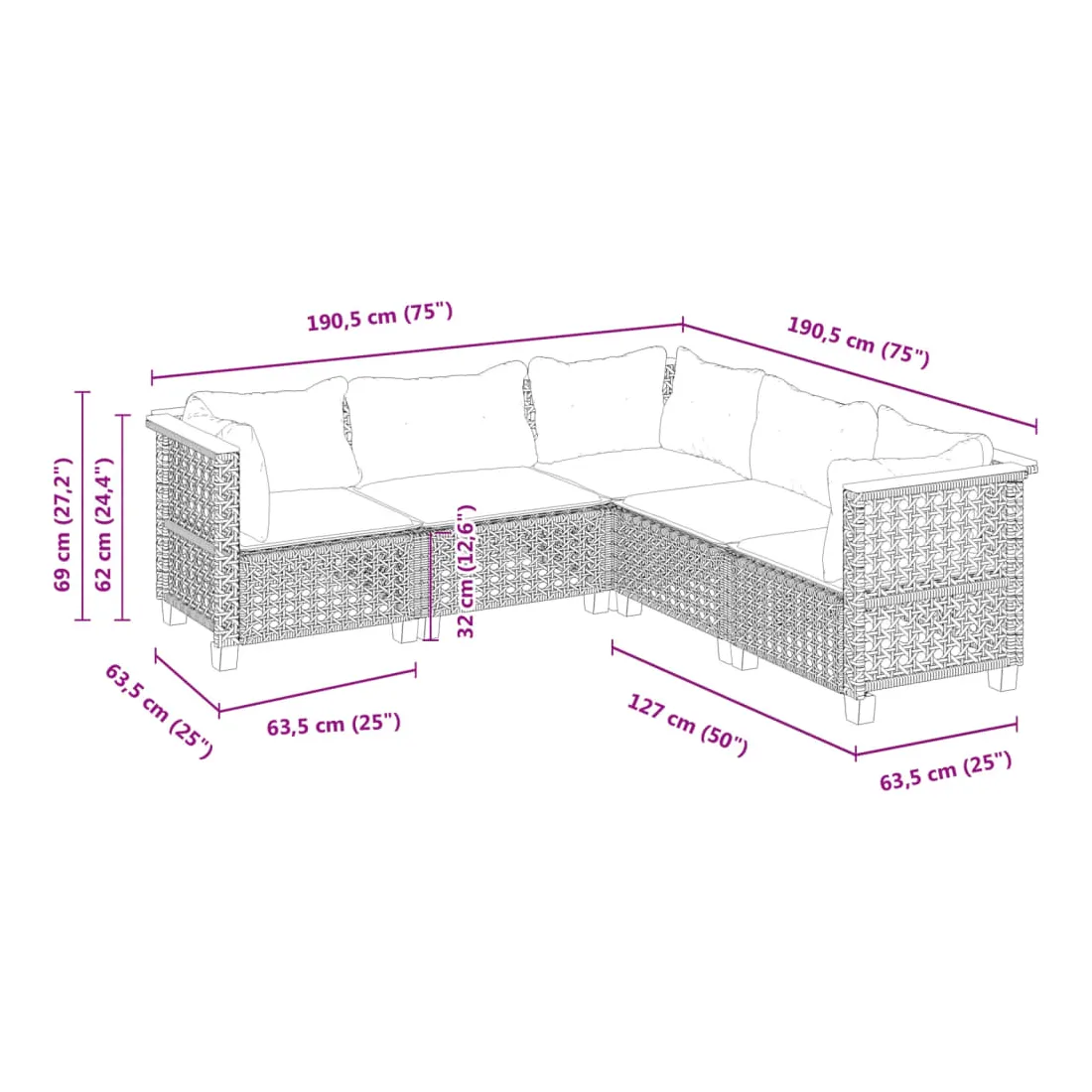 - Dimensions du coussin de dossier (angle) : 63,5 x 35 x 10 cm (L x l x é)