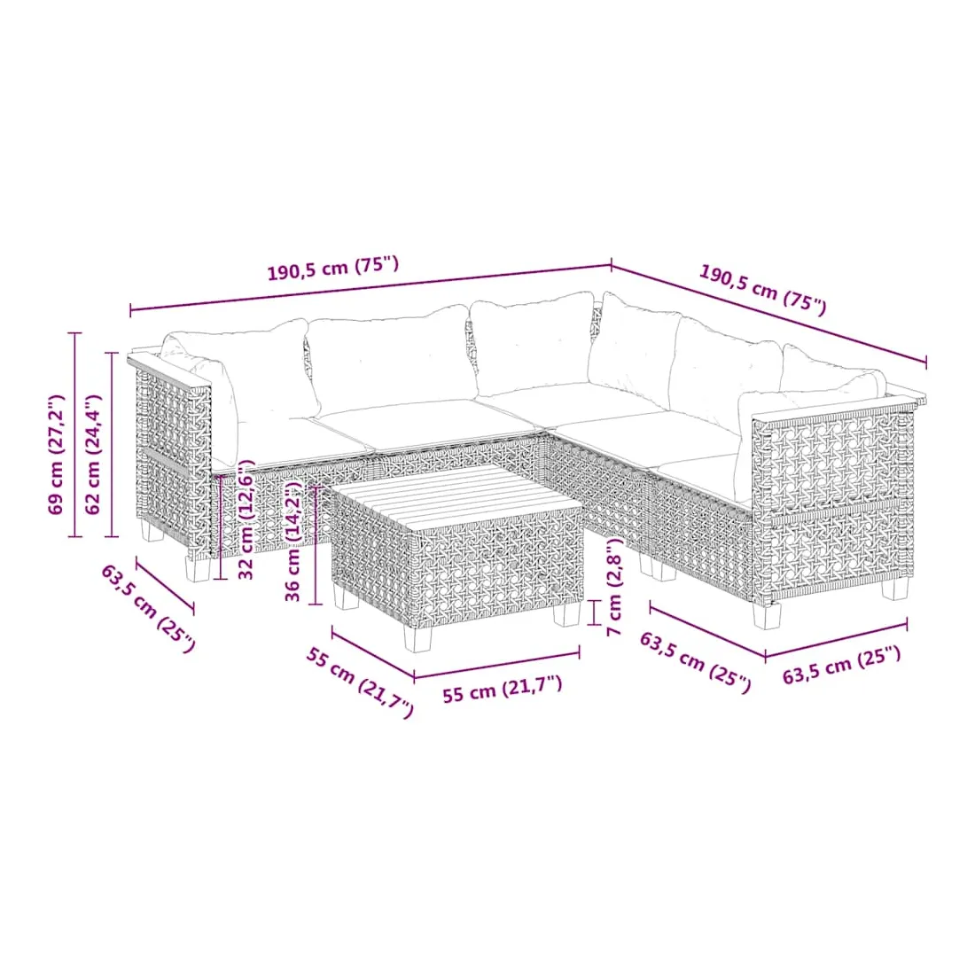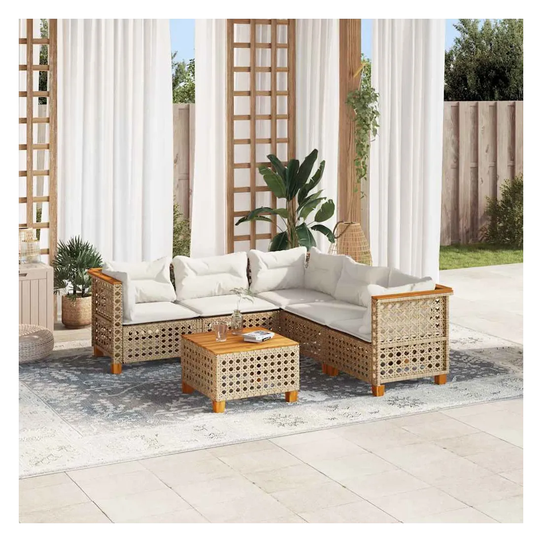 Cet ensemble de canapés de jardin est le complément parfait de votre arrière-cour, terrasse ou patio, offrant un espace confortable et accueillant pour discuter avec la famille et les amis ou simplement se détendre et profiter de l'extérieur. Matériau durable : la résine tressée, également connue sous le nom de poly rotin, est un matériau synthétique solide et nécessitant peu d'entretien qui ressemble au rotin naturel. Elle est légère, facile à nettoyer et couramment utilisée pour les meubles d'extérieur en raison de sa durabilité et de ses propriétés de résistance aux intempéries.Expérience d'assise confortable : ce mobilier d'extérieur, doté de coussins épais, offre une expérience d'assise confortable.Housse amovible et lavable : ces coussins de siège sont dotés de housses amovibles pour un lavage et un entretien faciles.Dessus stable et facile à nettoyer : cette table de jardin a un dessus en bois d'acacia robuste, durable et facile à nettoyer avec un chiffon humide.Conception modulaire : cet ensemble de meubles d'extérieur a une conception modulaire, ce qui le rend complètement flexible et facile à déplacer, afin que vous puissiez créer un agencement de meubles d'extérieur personnalisé. Bon à savoir :Pour que vos meubles d'extérieur restent beaux, nous vous recommandons de les protéger avec une housse imperméable.