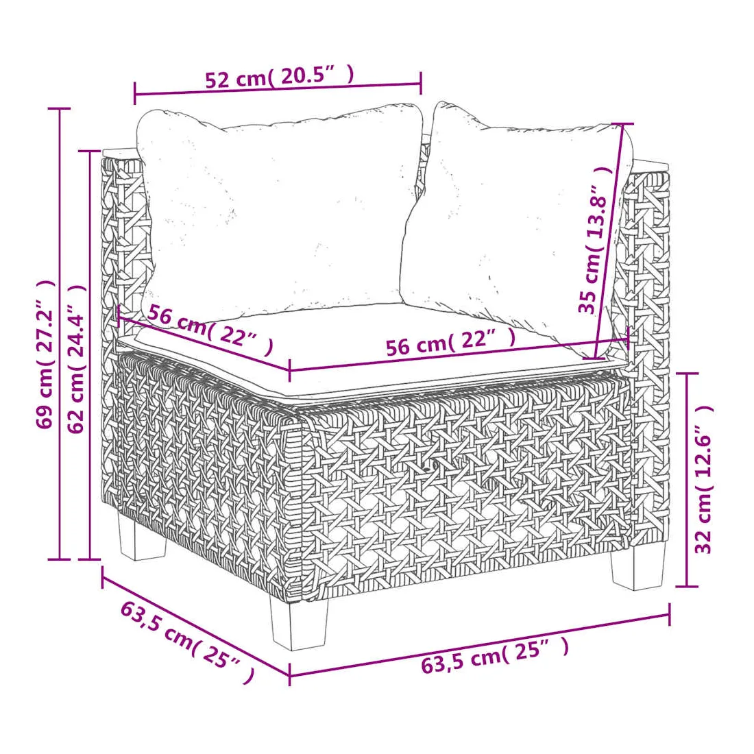 • Dimensions du coussin d’assise (angle) : 63,5 x 56,5 x 3 cm (l x P x é)