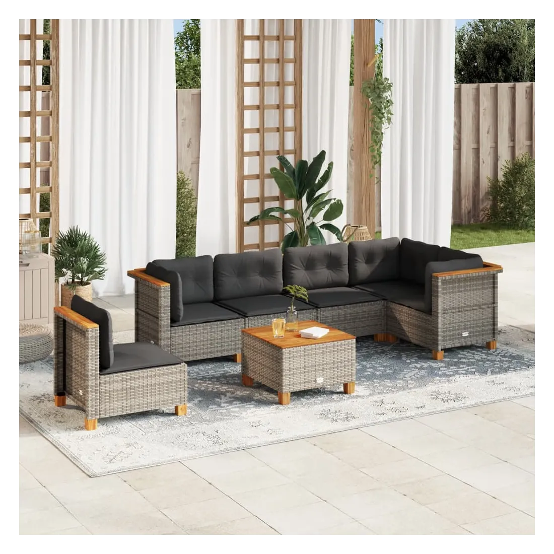 Cet ensemble de canapés de jardin est le complément parfait de votre arrière-cour, terrasse ou patio, offrant un espace confortable et accueillant pour discuter avec la famille et les amis ou simplement se détendre et profiter de l'extérieur. Matériau durable : la résine tressée, également connue sous le nom de poly rotin, est un matériau synthétique solide et nécessitant peu d'entretien qui ressemble au rotin naturel. Il est léger, facile à nettoyer et couramment utilisé pour les meubles d'extérieur en raison de sa durabilité et de ses propriétés de résistance aux intempéries.Expérience d'assise confortable : ce mobilier d'extérieur, doté de coussins épais, offre une expérience d'assise confortable.Housse amovible et lavable : ces coussins de siège sont dotés de housses amovibles pour un lavage et un entretien faciles.Dessus stable et facile à nettoyer : cette table de jardin a un dessus en bois d'acacia robuste, durable et facile à nettoyer avec un chiffon humide.Conception modulaire : cet ensemble de meubles d'extérieur a une conception modulaire, ce qui le rend complètement flexible et facile à déplacer, afin que vous puissiez créer un agencement de meubles d'extérieur personnalisé. Bon à savoir :Pour que vos meubles d'extérieur restent beaux, nous vous recommandons de les protéger avec une housse imperméable.