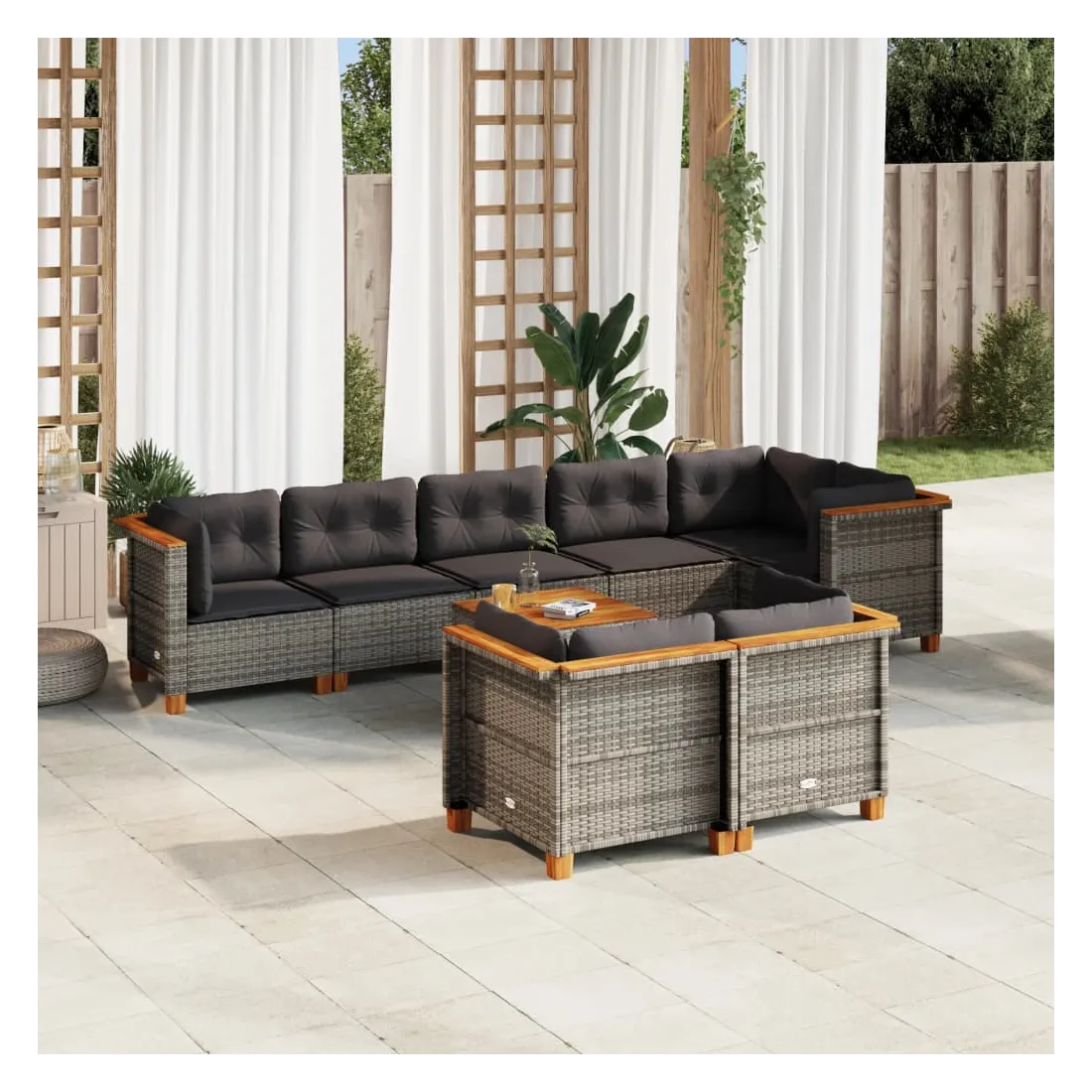 Cet ensemble de canapés de jardin est le complément parfait de votre arrière-cour, terrasse ou patio, offrant un espace confortable et accueillant pour discuter avec la famille et les amis ou simplement se détendre et profiter de l'extérieur. Matériau durable : la résine tressée, également connue sous le nom de poly rotin, est un matériau synthétique solide et nécessitant peu d'entretien qui ressemble au rotin naturel. Il est léger, facile à nettoyer et couramment utilisé pour les meubles d'extérieur en raison de sa durabilité et de ses propriétés de résistance aux intempéries.Expérience d'assise confortable : ce mobilier d'extérieur, doté de coussins épais, offre une expérience d'assise confortable.Housse amovible et lavable : ces coussins de siège sont dotés de housses amovibles pour un lavage et un entretien faciles.Dessus stable et facile à nettoyer : cette table de jardin a un dessus en bois d'acacia robuste, durable et facile à nettoyer avec un chiffon humide.Conception modulaire : cet ensemble de meubles d'extérieur a une conception modulaire, ce qui le rend complètement flexible et facile à déplacer, afin que vous puissiez créer un agencement de meubles d'extérieur personnalisé. Bon à savoir :Pour que vos meubles d'extérieur restent beaux, nous vous recommandons de les protéger avec une housse imperméable.