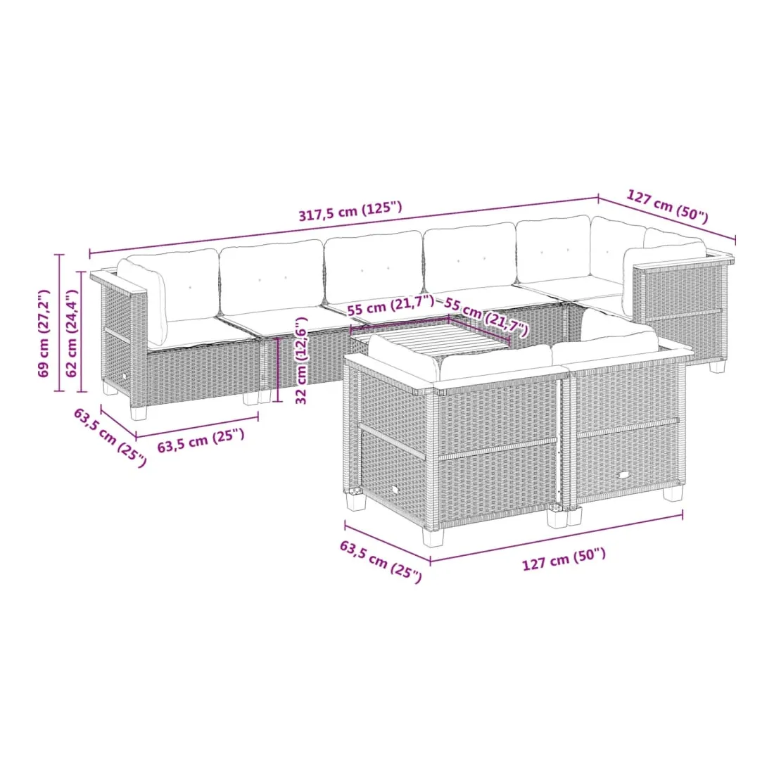 - Dimensions du coussin de dossier (angle) : 63,5 x 35 x 10 cm (L x l x é)