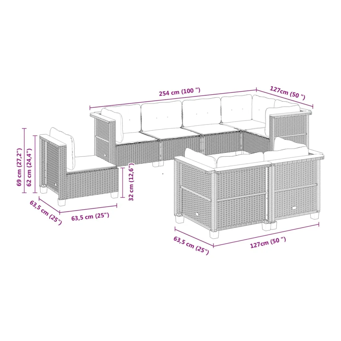 - Dimensions du coussin de dossier (angle) : 63,5 x 35 x 10 cm (L x l x é)