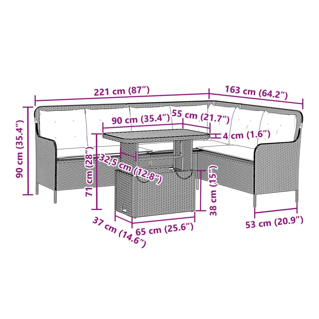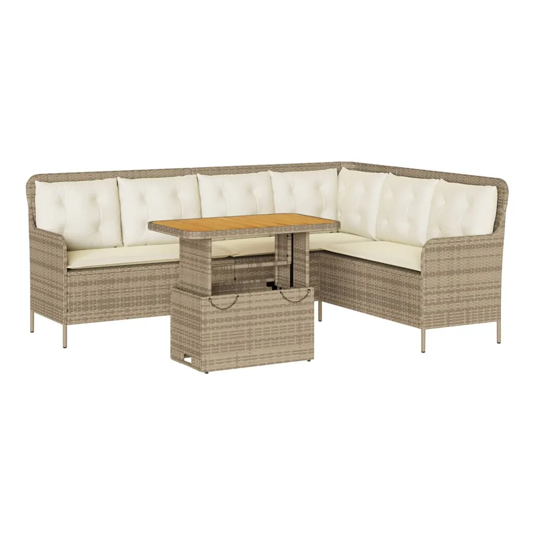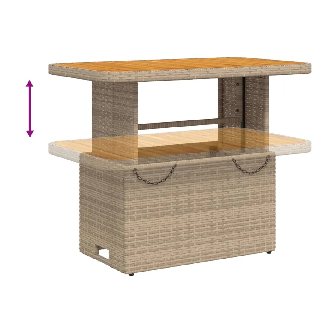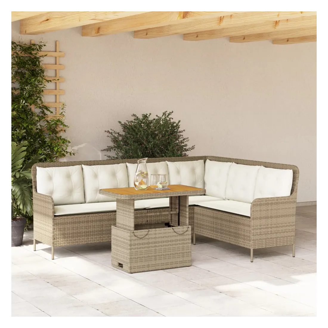 Cet ensemble de canapés de jardin est le complément parfait de votre arrière-cour, terrasse ou patio, offrant un espace confortable et accueillant pour discuter avec la famille et les amis ou simplement se détendre et profiter de l'extérieur. Matériau durable : la résine tressée, également connue sous le nom de poly rotin, est un matériau synthétique solide et nécessitant peu d'entretien qui ressemble au rotin naturel. Elle est légère, facile à nettoyer et couramment utilisée pour les meubles d'extérieur en raison de sa durabilité et de ses propriétés de résistance aux intempéries.Expérience d'assise confortable : ce mobilier d'extérieur, doté de coussins épais, offre une expérience d'assise confortable.Housse amovible et lavable : ces coussins de siège sont dotés de housses amovibles pour un lavage et un entretien faciles.Dessus de table réglable : le dessus de table peut être soulevé pour rendre la table plus haute, ce qui transforme la table d'extérieur d'une table basse à une table de salle à manger. Elle est parfaite pour recevoir des invités ou prendre des repas à l'extérieur.Dessus stable et facile à nettoyer : cette table de jardin a un dessus en bois d'acacia robuste, durable et facile à nettoyer avec un chiffon humide. Bon à savoir :Pour que vos meubles d'extérieur restent beaux, nous vous recommandons de les protéger avec une housse imperméable.
