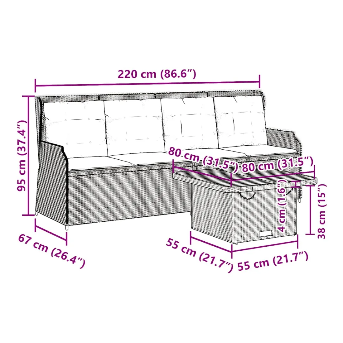 - Dimensions : 80 x 80 x 40/71 cm (L x l x H)
