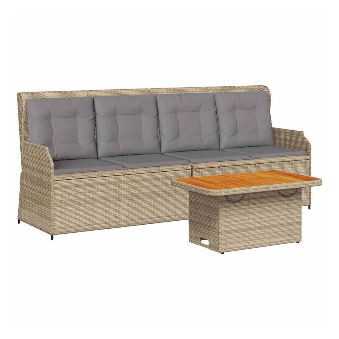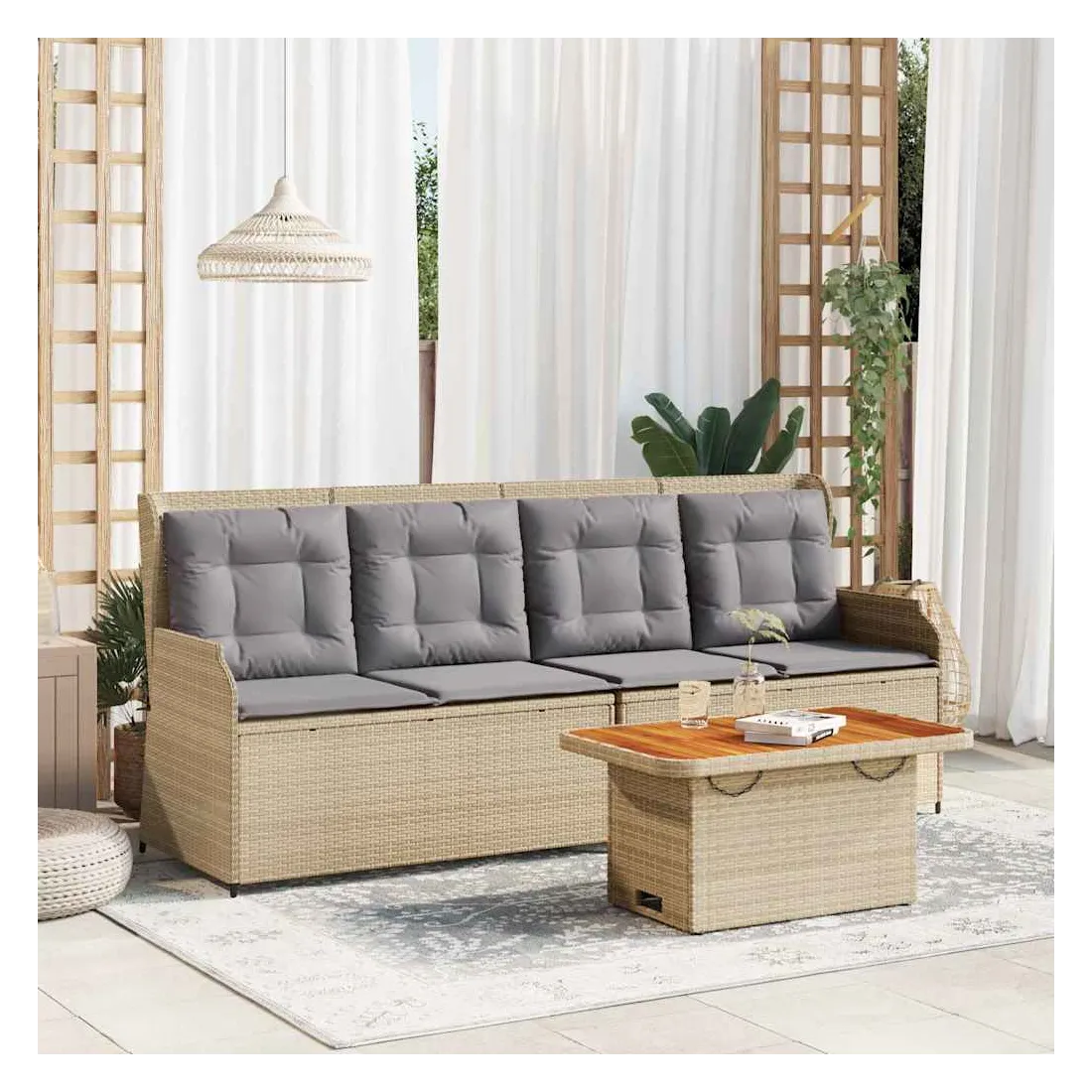 Cet ensemble de salon de jardin est le complément parfait de votre arrière-cour, terrasse ou patio, offrant un espace confortable et accueillant pour discuter avec la famille et les amis ou simplement se détendre et profiter de l'extérieur. Matériau durable : la résine tressée, également connue sous le nom de poly rotin, est un matériau synthétique solide et nécessitant peu d'entretien qui ressemble au rotin naturel. Elle est légère, facile à nettoyer et couramment utilisée pour les meubles d'extérieur en raison de sa durabilité et de ses propriétés de résistance aux intempéries.Dossier réglable : vous pouvez régler le dossier dans n'importe quelle position en tirant sur la poignée et le remettre rapidement dans sa position initiale.Housse amovible et lavable : ces coussins de siège sont dotés de housses amovibles pour un lavage et un entretien faciles.Expérience d'assise confortable : ce mobilier d'extérieur, doté de coussins épais, offre une expérience d'assise confortable.Dessus stable et facile à nettoyer : cette table de jardin a un dessus en bois d'acacia robuste, durable et facile à nettoyer avec un chiffon humide.Cadre robuste et stable : le cadre en acier enduit de poudre est solide, stable, durable et résistant à la corrosion et aux intempéries, ce qui garantit des performances durables. Bon à savoir :Pour que vos meubles d'extérieur restent beaux, nous vous recommandons de les protéger avec une housse imperméable.
