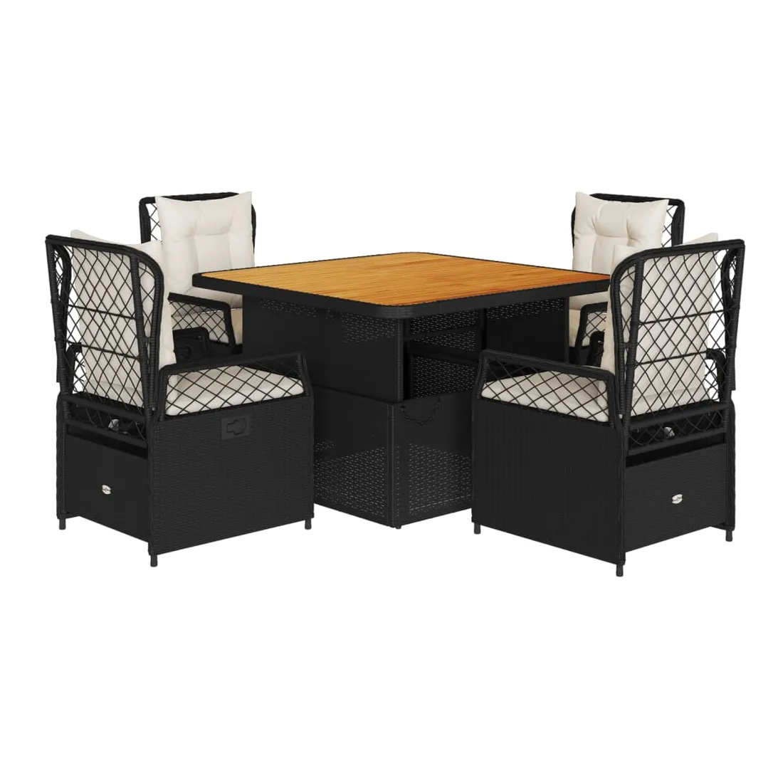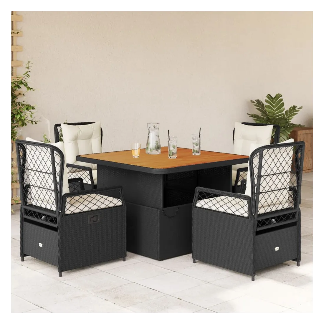 Cet ensemble de salle à manger de jardin est un excellent choix pour les repas en plein air ou pour vous détendre dans le jardin, dans l'arrière-cour ou sur la terrasse. Matériau durable : la résine tressée, également connue sous le nom de poly rotin, est un matériau synthétique solide et nécessitant peu d'entretien qui ressemble au rotin naturel. Il est léger, facile à nettoyer et couramment utilisé pour les meubles d'extérieur en raison de sa durabilité et de ses propriétés de résistance aux intempéries.Dossier réglable : ce siège de jardin est doté d'une poignée. Vous pouvez régler le dossier dans n'importe quelle position en tirant sur la poignée et le remettre rapidement dans sa position initiale.Housse amovible et lavable : le coussin de siège est doté d'une housse amovible pour un lavage et un entretien faciles.Dessus de table réglable : le dessus de table peut être soulevé pour rendre la table plus haute, ce qui transforme la table d'extérieur d'une table basse à une table de salle à manger. Elle est parfaite pour recevoir des invités ou prendre des repas à l'extérieur.Dessus stable et facile à nettoyer : cette table de jardin a un dessus en bois d'acacia robuste, durable et facile à nettoyer avec un chiffon humide. Bon à savoir :Pour que vos meubles d'extérieur restent beaux, nous vous recommandons de les protéger avec une housse imperméable.