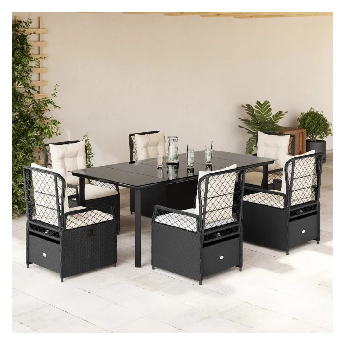 Cet ensemble de salle à manger de jardin est un excellent choix pour les repas en plein air ou pour vous détendre dans le jardin, dans l'arrière-cour ou sur la terrasse. Matériau durable : la résine tressée, également connue sous le nom de poly rotin, est un matériau synthétique solide et nécessitant peu d'entretien qui ressemble au rotin naturel. Il est léger, facile à nettoyer et couramment utilisé pour les meubles d'extérieur en raison de sa durabilité et de ses propriétés de résistance aux intempéries.Dossier réglable : ce siège de jardin est doté d'une poignée. Vous pouvez régler le dossier dans n'importe quelle position en tirant sur la poignée et le remettre rapidement dans sa position initiale.Expérience d'assise confortable : ce mobilier d'extérieur, doté de coussins épais, offre une expérience d'assise confortable.Housse amovible et lavable : le coussin de siège est doté d'une housse amovible pour un lavage et un entretien faciles.Dessus en verre : le dessus de la table d'extérieur est fabriqué en verre trempé solide et durable, ce qui le rend facile à nettoyer avec un chiffon humide et ajoute une touche d'élégance à votre espace extérieur. Bon à savoir :Pour que vos meubles d'extérieur restent beaux, nous vous recommandons de les protéger avec une housse imperméable.