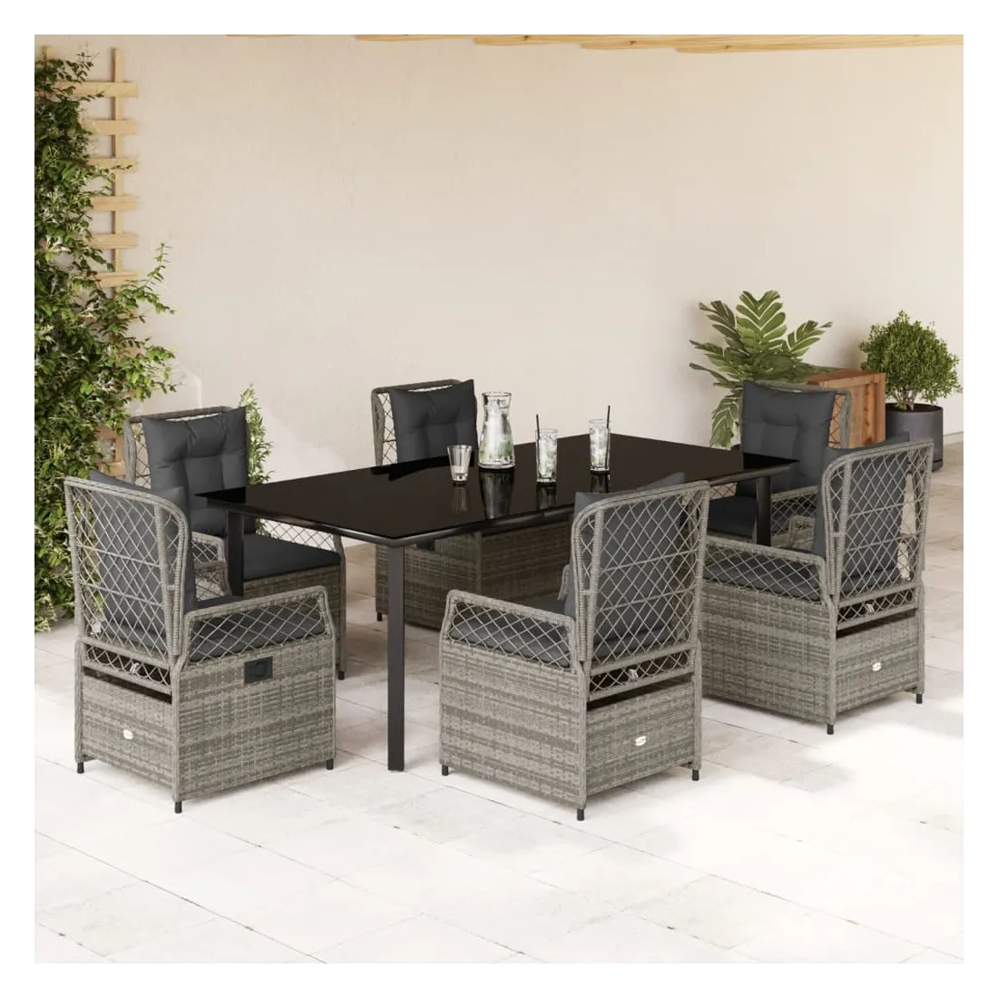 Cet ensemble de salle à manger de jardin est un excellent choix pour les repas en plein air ou pour vous détendre dans le jardin, dans l'arrière-cour ou sur la terrasse. Matériau durable : la résine tressée, également connue sous le nom de poly rotin, est un matériau synthétique solide et nécessitant peu d'entretien qui ressemble au rotin naturel. Il est léger, facile à nettoyer et couramment utilisé pour les meubles d'extérieur en raison de sa durabilité et de ses propriétés de résistance aux intempéries.Dossier réglable : ce siège de jardin est doté d'une poignée. Vous pouvez régler le dossier dans n'importe quelle position en tirant sur la poignée et le remettre rapidement dans sa position initiale.Expérience d'assise confortable : ce mobilier d'extérieur, doté de coussins épais, offre une expérience d'assise confortable.Housse amovible et lavable : le coussin de siège est doté d'une housse amovible pour un lavage et un entretien faciles.Dessus en verre : le dessus de la table d'extérieur est fabriqué en verre trempé solide et durable, ce qui le rend facile à nettoyer avec un chiffon humide et ajoute une touche d'élégance à votre espace extérieur. Bon à savoir :Pour que vos meubles d'extérieur restent beaux, nous vous recommandons de les protéger avec une housse imperméable.